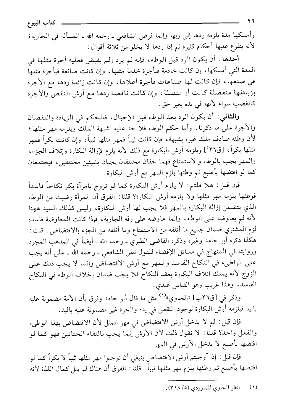 فإن قيل: هلا قلتم: لا يلزم أرش البكارة كما لو تزوج بامرأة بكر نكاحًا فاسدًا فوطئها يلزمه مهر مثلها ولا يلزمه أرش البكارة؟ قلنا: الفرق أن المرأة رضيت من الوطء الذي يتضمن إزالة البكارة بالمهر فلا يجب لها أرش البكارة، وليس كذلك السيد ههنا لأنه لم يعاوضه على الوطء، وإنما عاوضه على رقة الجارية، فإذا كانت المعاوضة فاسدة لزم المشتري ضمان جميع ما أتلفه من الاستمتاع وما أتلفه من الجزء بالافتضاض. قلت: هكذا ذكره أبو حامد وغيره وذكره القاضي الطبري -رحمه الله -أيضًا في المذهب المجرد وروايته في المنهاج في مسائل الإفضاء للقول نص الشافعي -رحمه الله -على أنه يجب على الواطئ في النكاح الفاسد والمهر مع أرش الافتضاض وإنما لا يجب ذلك على الزوج لأنه يملك إتلاف البكارة بعقد النكاح فلا يجب ضمان بخلاف الوطء في النكاح الفاسد، وهذا غريب وهو القياس عندي.