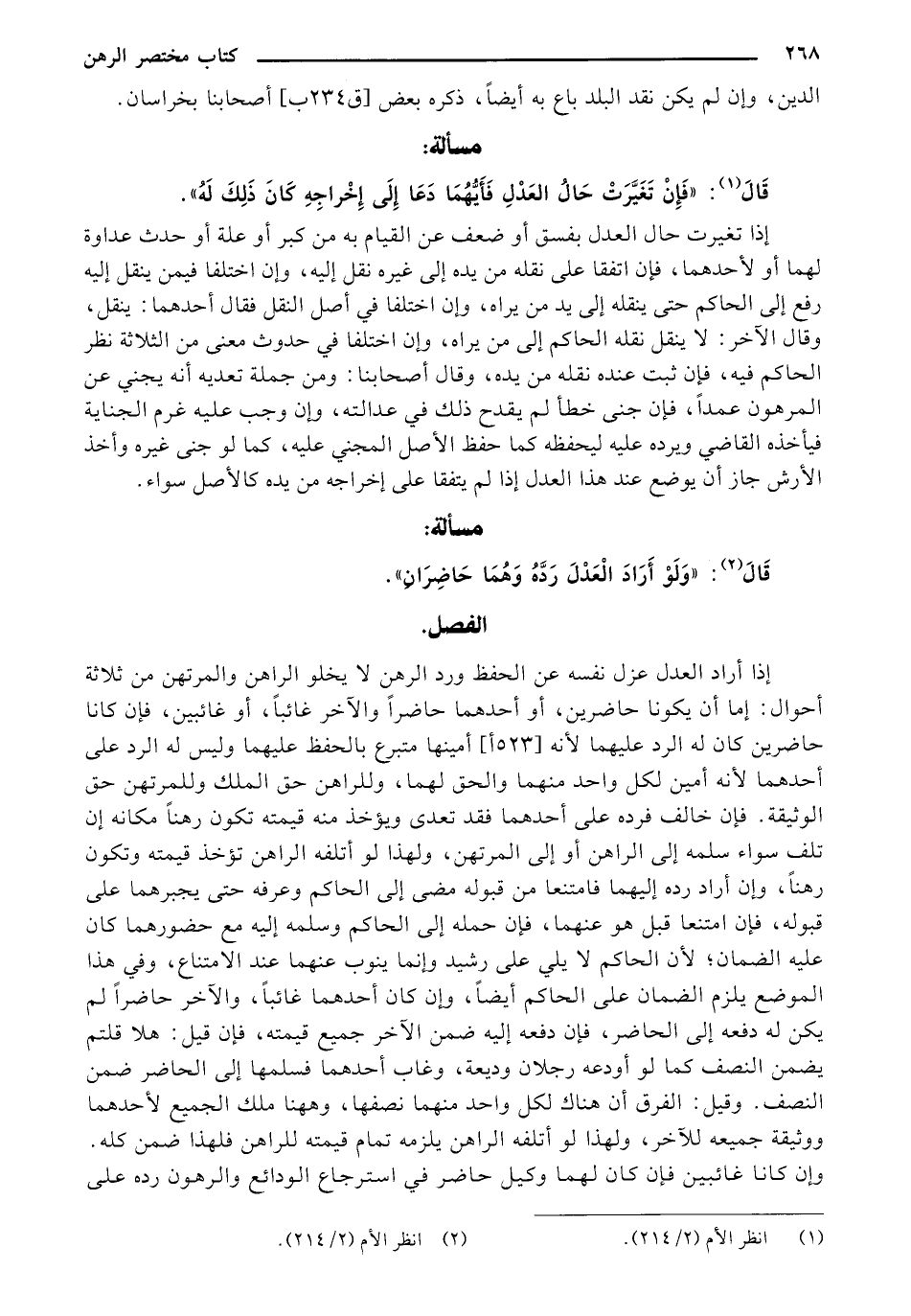 إذا أراد العدل عزل نفسه عن الحفظ ورد الرهن لا يخلو الراهن والمرتهن من ثلاثة أحوال: إما أن يكونا حاضرين, أو أحدهما حاضرًا والآخر غائبًا, أو غائبين, فإن كانا حاضرين كان له الرد عليهما لأنه [523 أ] أمينها متبرع بالحفظ عليهما وليس له الرد على أحدهما لأنه أمين لكل واحد منهما والحق لهما, وللراهن حق الملك وللمرتهن حق الوثيقة. فإن خالف فرده على أحدهما فقد تعدى ويؤخذ منه قيمته تكون رهنًا مكانه إن تلف سواء سلمه إلى الراهن أو إلى المرتهن, ولهذا لو أتلفه الراهن تؤخذ قيمته وتكون رهنًا, وإن أراد رده إليهما فامتنعا من قبوله مضى إلى الحاكم وعرفه حتى يجبرهما على قبوله, فإن امتنعا قبل هو عنهما, فإن حمله إلى الحاكم وسلمه إليه مع حضورهما كان عليه الضمان؛ لأن الحاكم لا يلي على رشيد وإنما ينوب عنهما عند الامتناع, وفي هذا الموضع يلزم الضمان على الحاكم أيضًا, وإن كان أحدهما غائبًا والآخر حاضرًا لم يكن له دفعه إلى الحاضر, فإن دفعه إليه ضمن الآخر جميع قيمته, فإن قيل: هلا قلتم يضمن النصف. وقيل: الفرق أن هناك لكل واحد منهما نصفها, وههنا ملك الجميع لأحدهما ووثيقة للآخر, ولهذا لو أتلفه الراهن يلزمه تمام قيمته للراهن فلهذا ضمن كله. وإن كانا غائبين فإن كان لهما وكيل حاضر في استرجاع الودائع والرهون رده على