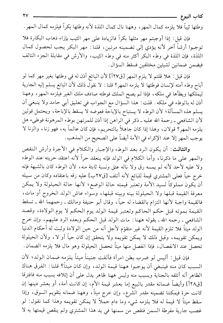 والثالث: أن يكون الرد بعد الوطء والإجبار والكلام في الأجرة وأرش النقض والمهر على ما ذكرنا، وأما الكلام في الولد فإنه ينعقد حرًا لأنه اعتقد حريته عند الوطء ولا عليه لأحد لأنه لم يمسه رق ولا ناله عتق ونسبة ثابتة منه، لأن الوطء كان بالشبهة فإنه خرج حيًا فعلى المشتري قيمة للبائع لأنه أتلف [ق 27 ب] عليه رقه باعتقاده وكان من سبيله أن يكون مملوكًا لسيد الأمة وتعتبر قيمته حالة الوضع؛ لأنها حالة الحيلولة ولا يمكن معرفة القيمة قبلها ولا الحيلولة بينه وبينه قبلها، وسواء عاش الولد الخروج أو مات، فالقيمة واجبة لأنها التزام بالقضاء له حيًا، وقال أبو حنيفة ومالك -رحمهما الله - تسقط القيمة بموته قبل حكم الحاكم وتعتبر قيمة الولد يوم الحكم لا يوم الولادة، وقصد الشافعي -رحمه الله - بقوله ههنا: مات الولد قبل الحكم وبعده الرد عليها، وإن خرج الولد ميتًا فلا تلزم القيمة لأنه غير متقوّم لأجل أنه من حين الولادة وثبت له أحكام الدنيا ويمكن تقويمه، وقبل ذلك لا يمكن تقويمه ولا يتحقق إن كان حيًا أو لا، ولأن الحيلولة تحصل عند الانفصال، فإذا انفصل منها ميتًا تحصل الحيلولة وهو مال فلا يلزمه الضمان.