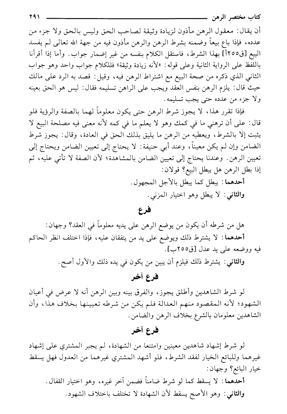 أن يقال: معقول الرهن مأذون لزيادة وثيقة لصاحب الحق وليس بالحق ولا جزء من عدده, فإذا باع بيعًا وضمنه بشرط الرهن والرهن مأذون فيه من جهة الله تعالى لم يفسد البيع [ق 255 أ] بهذا الشرط, فاستقل الكلام بنفسه من غير إضمار جواب. وأما إذا أقرأنا باللفظ على الرواية الثانية وعلى قوله: "لأنه زيادة وثيقة" فللكلام جواب واحد وهو جواب الثاني الذي ذكره من صحة البيع مع اشتراط الرهن فيه, وقيل: قصد به الرد على مالك حيث قال: يلزم الرهن بنفس العقد ويجب على الراهن تسليمه فقال: ليس هو الحق بعينه ولا جزء من عدده حتى يحب تسليمه.