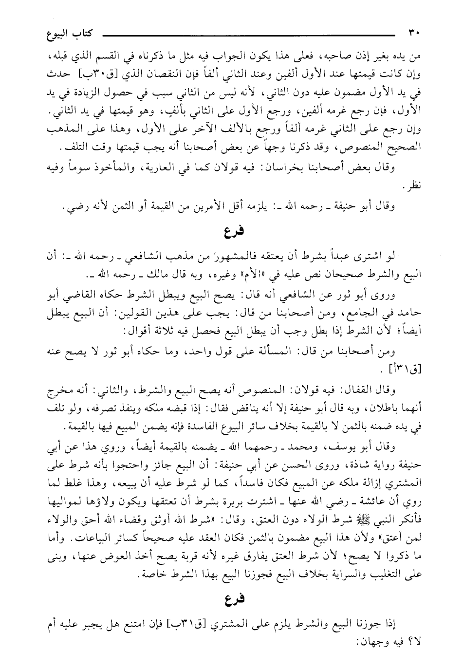 وقال أبو يوسف، ومحمد -رحمهما الله -يضمنه بالقيمة أيضًا، وروي هذا عن أبي حنيفة رواية شاذة، وروى الحسن عن أبي حنيفة: أن البيع جائز واحتجوا بأنه شرط على المشتري إزالة ملكه عن المبيع فكان فاسدًا، كما لو شرط عليه أن يبيعه، وهذا غلط لما روي أن عائشة -رضي الله عنها -اشترت بريرة بشرط أن تعتقها ويكون ولاؤها لمواليها فأنكر النبي صلى الله عليه وسلم شرط الولاء دون العتق، وقال: "شرط الله أوثق وقضاء الله أحق والولاء لمن أعتق" ولأن هذا البيع مضمون بالثمن فكان العقد عليه صحيحًا كسائر البياعات. وأما ما ذكروا لا يصح؛ لأن شرط العتق يفارق غيره لأنه قربة يصح أخذ العوض عنها، وبنى على التغليب والسراية بخلاف البيع فجوزنا البيع بهذا الشرط خاصة.