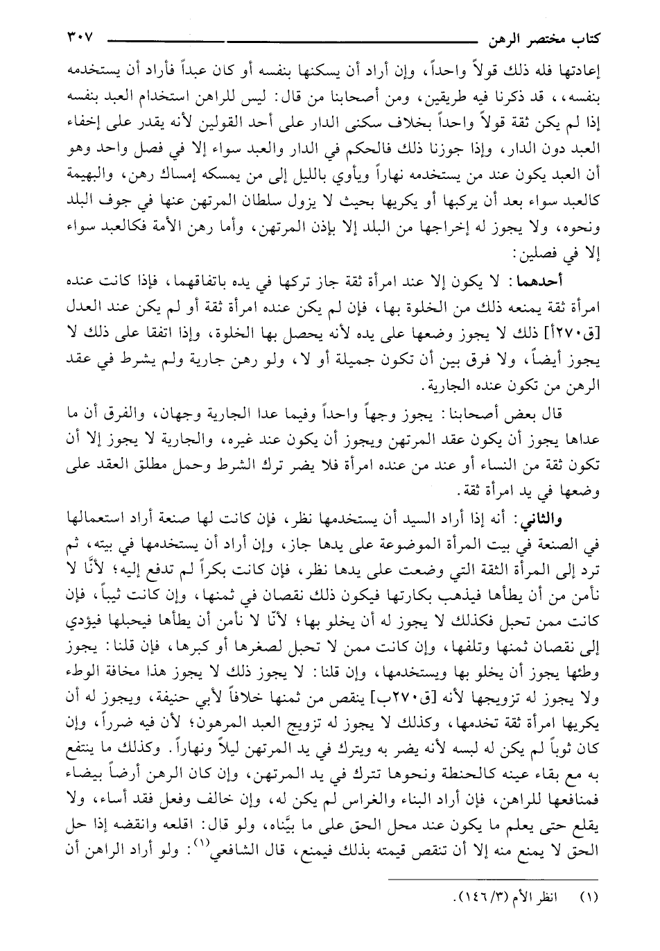 أحدهما: لا يكون إلا عند امرأة ثقة جاز تركها في يده باتفاقهما, فإذا كانت عنده امرأة ثقة يمنعه ذلك من الخلوة بها, فإن لم يكن عنده امرأة ثقة أو لم يكن عند العدل [ق 270 أ] ذلك لا يجوز وضعها على يده لأنه يحصل بها الخلوة, وإذا اتفقا على ذلك لا يجوز أيضًا, ولا فرق بين أن تكون جميلة أو لا, ولو رهن جارية ولم يشرط في عقد الرهن من تكون عنده الجارية.