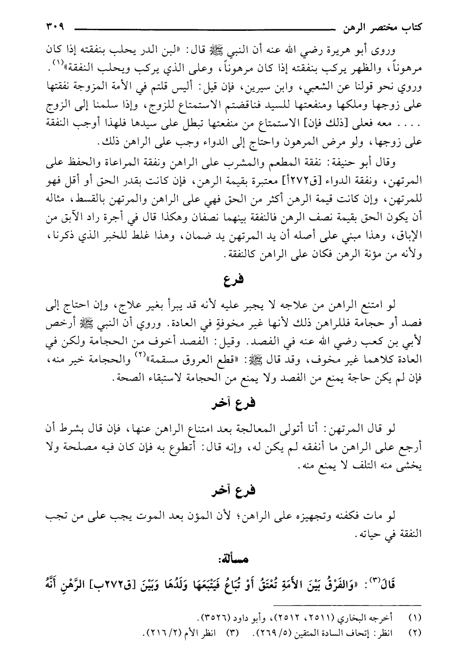 وروى أبو هريرة رضي الله عنه أن النبي صلى الله عليه وسلم قال: "لبن الدر يحلب بنفقته إذا كان مرهونًا, والظهر يركب بنفقته إذا كان مرهونًا, وعلى الذي يركب ويحلب النفقة". وروى نحو قلنا عن الشعبي, وابن سيرين, فإن قيل: أليس قلتم في الأمة المزوجة نفقتها على زوجها وملكها ومنفعتها للسيد فناقضتم الاستماع للزوج, وإذا سلمنا إلى الزوج .... معه فعلى [ذلك فإن] الاستماع من منفعتها تبطل على سيدها فلهذا أوجب النفقة على زوجها, ولو مرض المرهون واحتاج إلى الدواء وجب على الراهن ذلك.