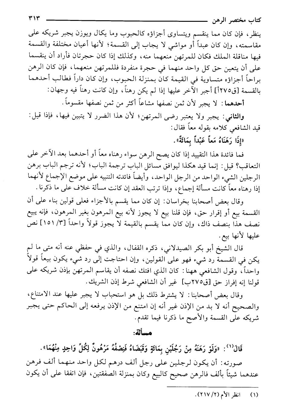 قال الشيخ أبو بكر الصيدلاني, ذكره القفال, والذي في حفظي عنه أنه متى ما لم يكون في القسمة رد شيء فهو على القولين, وإن احتاجت إلى رد شيء يكون بيعًا قولاً واحدًا, وقول الشافعي ههنا: كان الذي افتك نصفه أن يقاسم المرتهن بإذن شريكه على قولنا إنه إفراز حق [ق 275 ب] غير أن الشافعي شرط إذن الشريك.