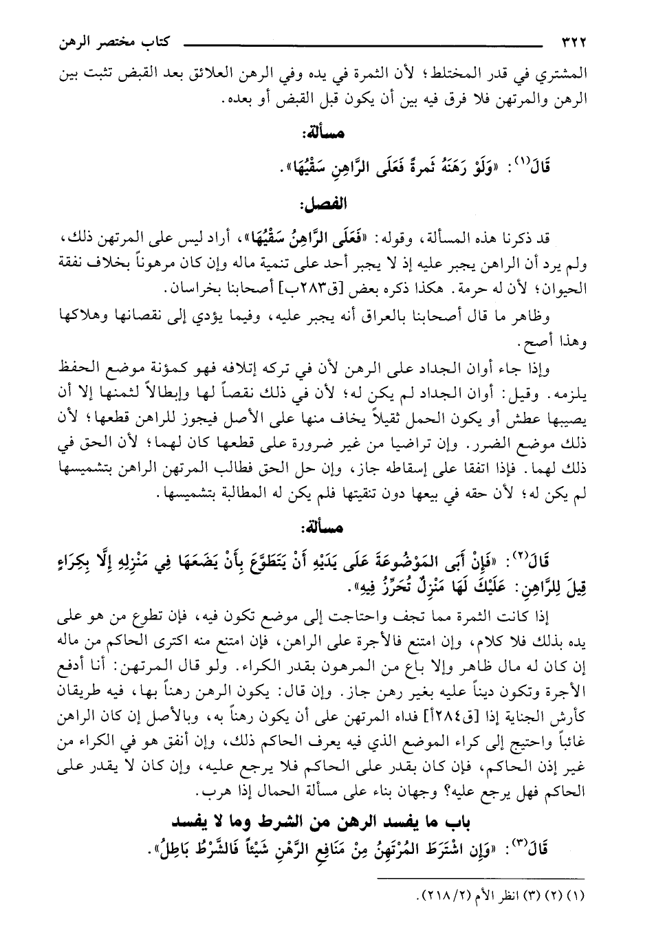 قد ذكرنا هذه المسألة، وقوله: "فَعَلَى الرَّاهِنِ سَقْيُهَا"، أراد ليس على المرتهن ذلك، ولم يرد أن الراهن يجبر عليه إذ لا يجبر أحد على تنمية ماله وإن كان مرهوناً بخلاف نفقة الحيوان؛ لأن له حرمة. هكذا ذكره بعض [ق 283 ب] أصحابنا بخراسان.