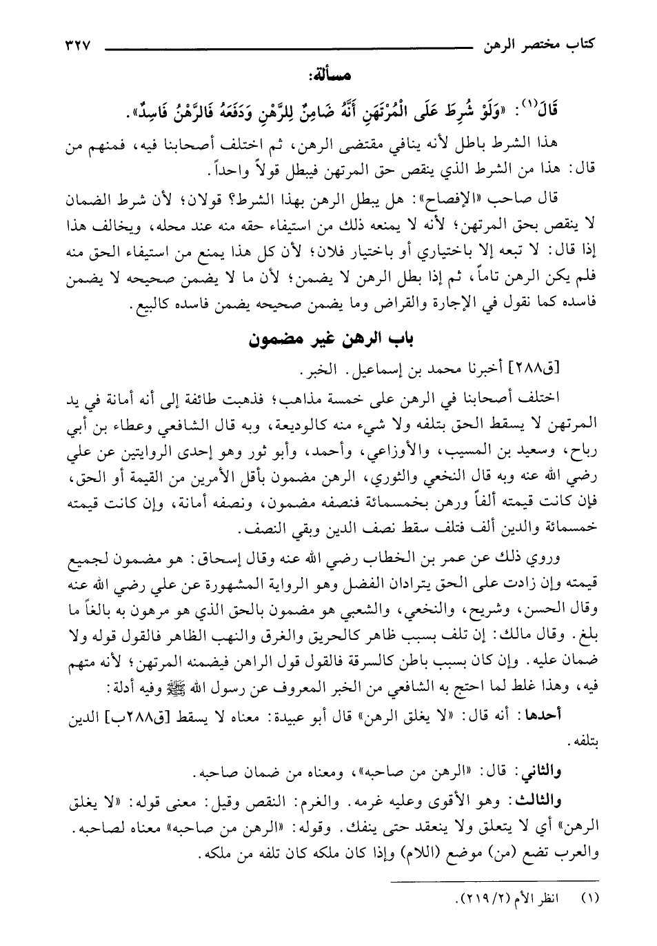 قال صاحب "الإفصاح": هل يبطل الرهن بهذا الشرط؟ قولان؛ لأن شرط الضمان لا ينقص بحق المرتهن؛ لأنه لا يمنعه ذلك من استيفاء حقه منه عند محله، ويخالف هذا إذا قال: لا تبعه إلا باختياري أو باختيار فلان؛ لأن كل هذا يمنع من استيفاء الحق منه فلم يكن الرهن تامًا، ثم إذا بطل الرهن لا يضمن؛ لأن ما لا يضمن صحيحه لا يضمن فاسده كما نقول في الإجارة والقراض وما يضمن صحيحه يضمن فاسده كالبيع.