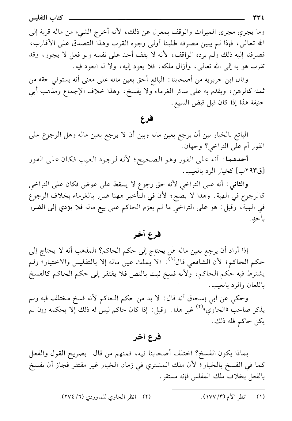 والثاني: أنه على التراخي لأنه حق رجوع لا يسقط على عوض فكان التراخي كالرجوع في الهبة. وهذا لا يصح؛ لأن في التأخير ههنا ضرر بالغرماء بخلاف الرجوع في الهبة, وقيل: هو على التراخي ما لم يعزم الحاكم على بيع ماله فلا يؤدي إلى الضرر بأحدٍ.