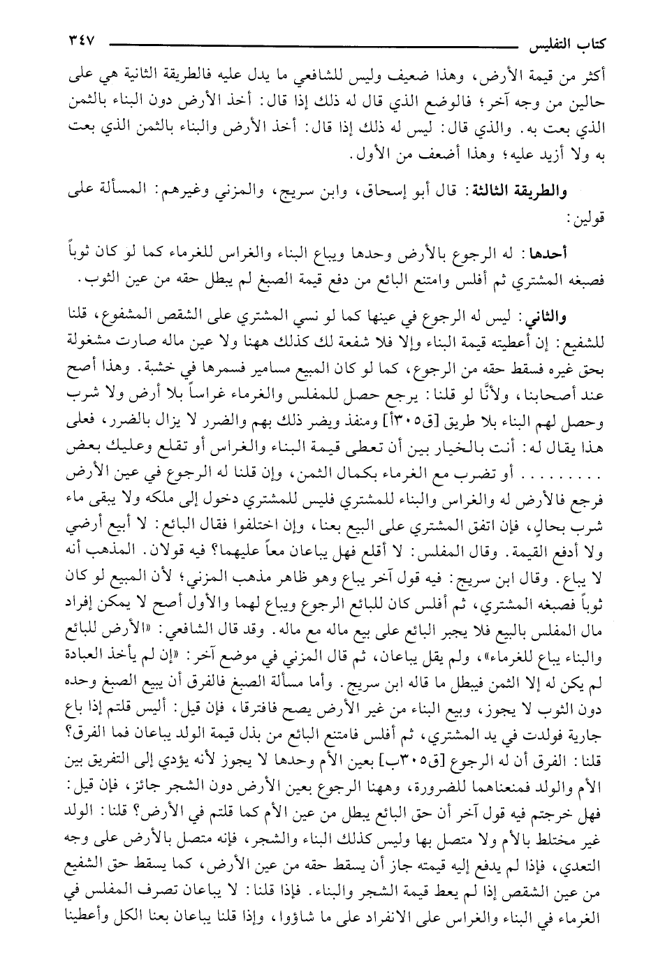 أكثر من قيمة الأرض، وهذا ضعيف وليس للشافعي ما يدل عليه فالطريقة الثانية هي على حالين من وجه آخر؛ فالوضع الذي قال له ذلك إذا قال: أخذ الأرض دون البناء بالثمن الذي بعت به. والذي قال: ليس له ذلك إذا قال: أخذ الأرض والبناء بالثمن الذي بعت به ولا أزيد عليه؛ وهذا أضعف من الأول.