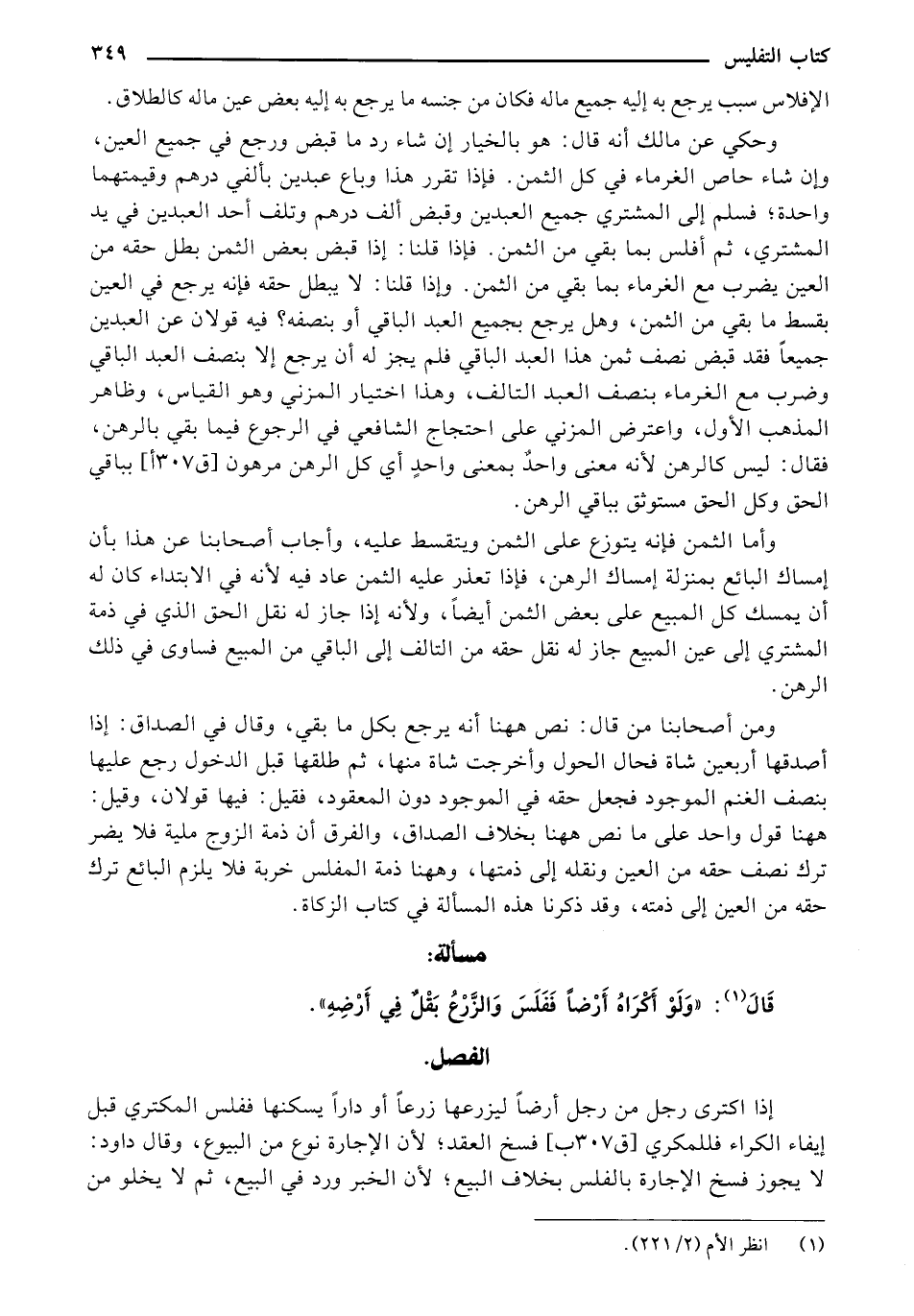 إذا اكترى رجل من رجل أرضًا ليزرعها زرعًا أو دارًا يسكنها ففلس المكتري قبل إيفاء الكراء فللمكري [ق 307 ب] فسخ العقد؛ لان الإجازة نوع من البيوع، وقال داود: لا يجوز فسخ الإجازة بالفلس بخلاف البيع؛ لأن الخبر ورد في البيع، ثم لا يخلو من