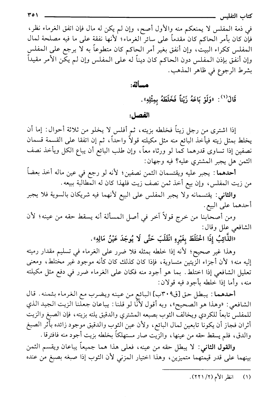 وهذا غير صحيح؛ لأنه إذا خلطه بمثله فلا ضرر على الغرماء في تسليم مقدرا رميته إليه منه؛ لأن أجزاء الزيتين متساوية, فإذا كان كذلك كان كأنه موجود غير مختلط, ومعنى تعليل الشافعي إذا اختلط. بما هو أجود منه فكان على الغرماء ضرر في دفع مثل مكيلته منه, وأما إذا خلطه بأجود فيه قولان: