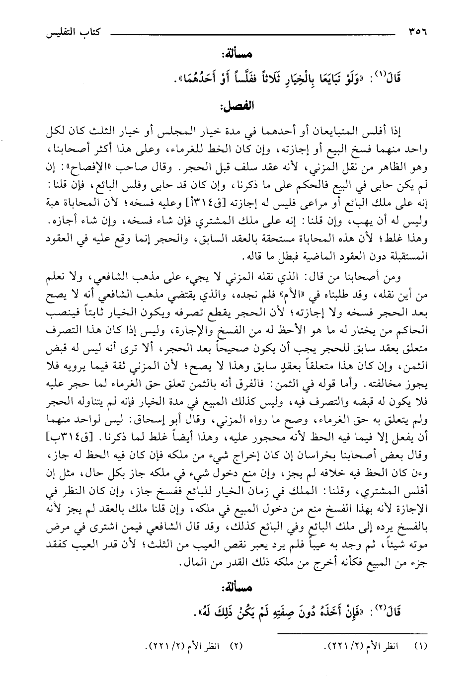 ومن أصحابنا من قال: الذي نقله المزني لا يجئ لى مذهب الشافعي, ولا نعلم من أين نقله, وقد طلبناه في "الأم" فلم نجده, والذي يقتضي مذهب الشافعي أنه لا يصح بعد الحجر فسخه ولا إجازته؛ لأن الحجر يقطع تصرفه ويكون الخيار ثابتًا فينصب الحاكم من يختار له ما هو الأحظ له من الفسخ والإجازة, وليس إذا كان هذا التصرف متعلق بعقد سابق للحجر يجب أن يكون صحيحًا بعد الحجر, ألا ترى أنه ليس له قبض الثمن, وإن كان هذا متعلقًا بعقدٍ سابق وهذا لا يصح؛ لأن المزني ثقة فيما يرويه فلا يجوز مخالفته. وأما قوله في الثمن: فالفرق أنه بالثمن تعلق حق الغرماء لما حجر عليه فلا يكون له قبضه والتصرف فيه, وليس كذلك المبيع في مدة الخيار فإنه لم يتناوله الحجر ولم يتعلق به حق الغرماء, وصح ما رواه المزني, وقال أبو إسحاق: ليس لواحد منهما أن يفعل إلا فيما فيه الحظ لأنه محجور عليه, وهذا أيضًا غلط لما ذكرنا. [ق 314 ب] وقال بعض أصحابنا بخراسان إن كان إخراج شيء من ملكه فإن كان فيه الحظ له جاز, وإن كان الحظ فيه خلافه لم يجز, وإن منع دخول شيء في ملكه جاز بكل حال, مثل إن أفلس المشتري, وقلنا: الملك في زمان الخيار للبائع ففسخ جاز, وإن كان النظر في الإجازة لأنه بهذا الفسخ منع دخول المبيع في ملكه, وإن قلنا ملك بالعقد لم يجز لأنه بالفسخ يرده إلى ملك البائع وفي البائع كذلك, وقد قال الشافعي فيمن اشترى في مرض موته شيئًا, ثم وجد به عيبًا فلم يرد يعبر نقص العيب من الثلث؛ لأن قدر العيب كفقد جزء من المبيع فكأنه أخرج من ملكه ذلك القدر من المال.