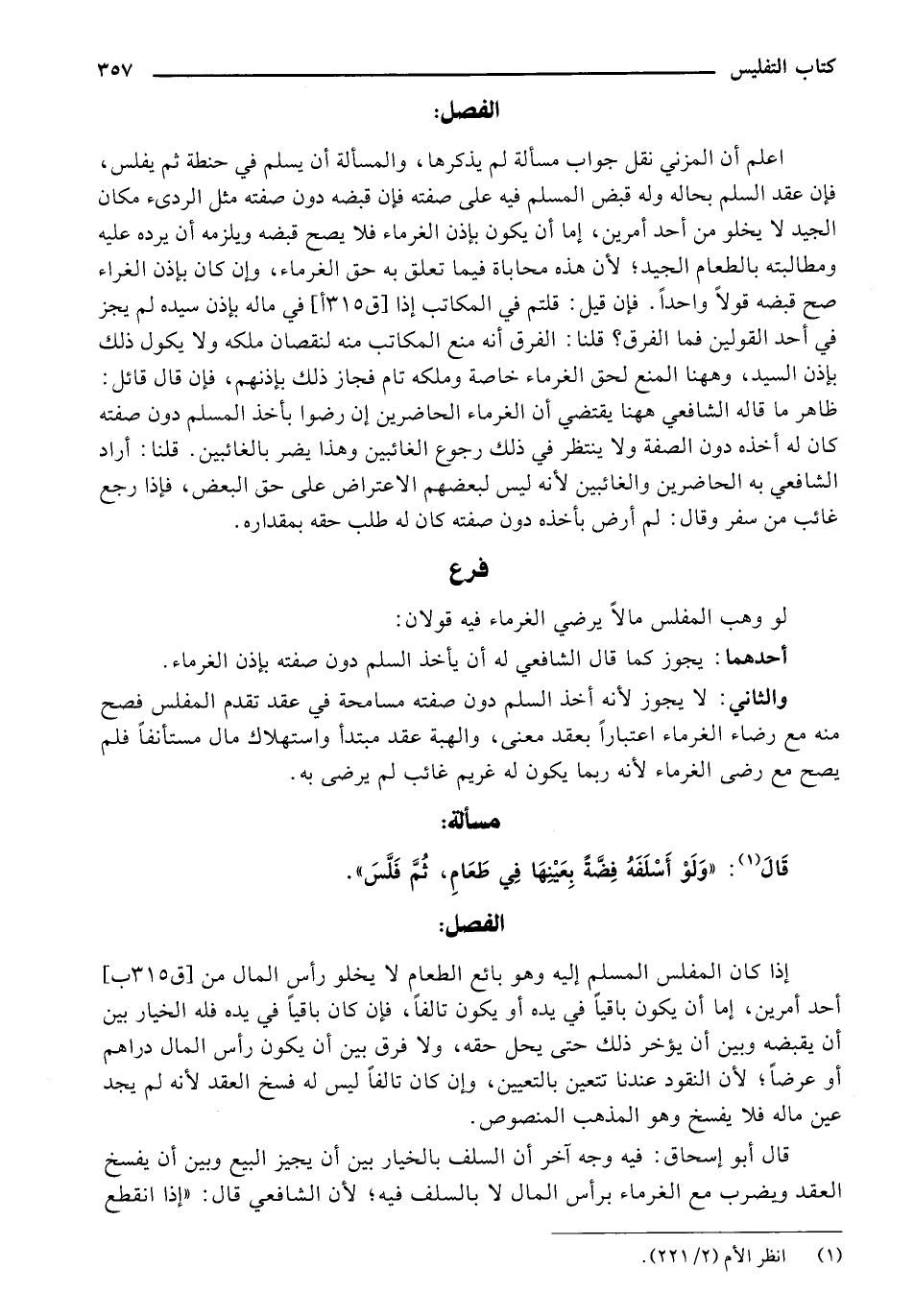 اعلم أن المزني نقل جواب مسألة لم يذكرها, والمسألة أن يسلم في حنطة ثم يفلس, فإن عقد السلم بحاله وله قبض المسلم فيه على صفته فإن قبضه دون صفته مثل الردئ مكان الجيد لا يخلو من أحد أمرين, إما أن يكون بإذن الغرماء فلا يصح قبضه ويلزمه أن يرده عليه ومطالبته بالطام الجيد؛ لأن هذه محاباة فيما تعلق به حق الغرماء, وإن كان بإذن الغرماء صح قبضه قولًا واحدًا. فإن قيل: قلتم في المكاتب إذا [ق 315 أ] في ماله بإذن سيده لم يجز في أحد القولين فما الفرق؟ قلنا: الفرق أنه منع المكاتب منه لنقصان ملكه ولا يكول ذلك بإذن السيد, وههنا المنع لحق الغرماء خاصة وملكه تام فجاز ذلك بإذنهم, فإن قال قائل: ظاهر ما قاله الشافعي ههنا يقتضى أن الغرماء الحاضرين إن رضوا بأخذ المسلم دون صفته كان له أخذه دون الصفة ولا ينتظر في ذلك رجوع الغائبين وهذا يضر بالغائبين. قلنا: أراد الشافعي به الحاضرين والغائبين لأنه ليس لبعضهم الاعتراض على حق البعض, فإذا رجع غائب من سفر وقال: لم أرض بأخذه دون صفته كان له طلب حقه بمقداره.