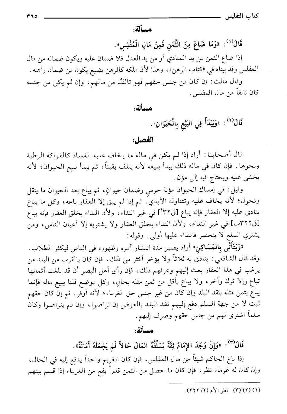 وقيل: في إمساك الحيوان مؤنه حرسٍ وضمان حيوانٍ، ثم يباع بعد الحيوان ما ينقل وتحول؛ لأنه يخاف عليه وتتناوله الأيدي. ثم إذا لم يبق إلا العقار باعه، وكل ما يباع ينادى عليه إلا العقار فإنه يباع [ق 32 أ] في غير النداء، ولأن النداء يخلق العقار فإنه يباع [ق 322 ب] في غير النداء، ولأن النداء يخلق العقار ولا يشتريه إلا أعيان الناس، ومن يشتري السلع لا ينحصر فالنداء عليها أولى. وقوله: