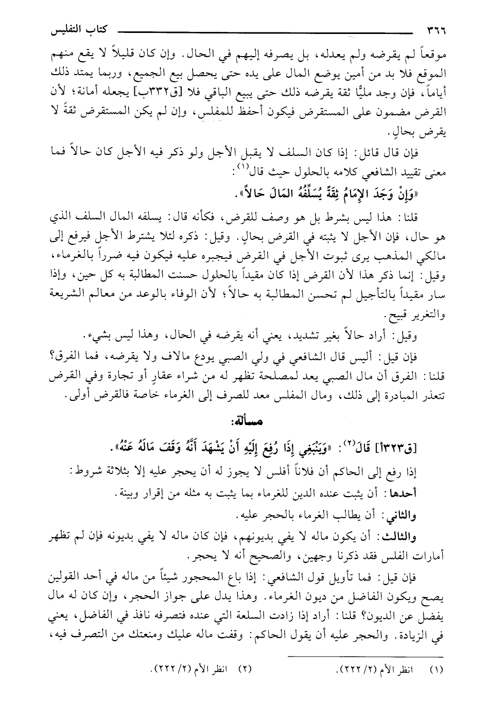 قلنا: هذا ليس بشرط بل هو وصف للقرض، فكأنه قال: يسلفه المال السلف الذي هو حال، فإن الأجل لا يثبته في القرض بحالٍ. وقيل لئلا يشترط الأجل فيرفع إلى مالكي المذهب يرى ثبوت الأجل في القرض فيجبره عليه فيكون فيه ضررا بالغرماء، وقيل: إنما ذكر هذا لأن القرض إذا كان مقيدا بالحلول حسنت المطالبة به كل حين، وإذا سار مقيدا بالتأجيل لم تحسن المطالبة به حالا؛ لأن الوفاء بالوعد من معالم الشريعة والتغرير قبيح.