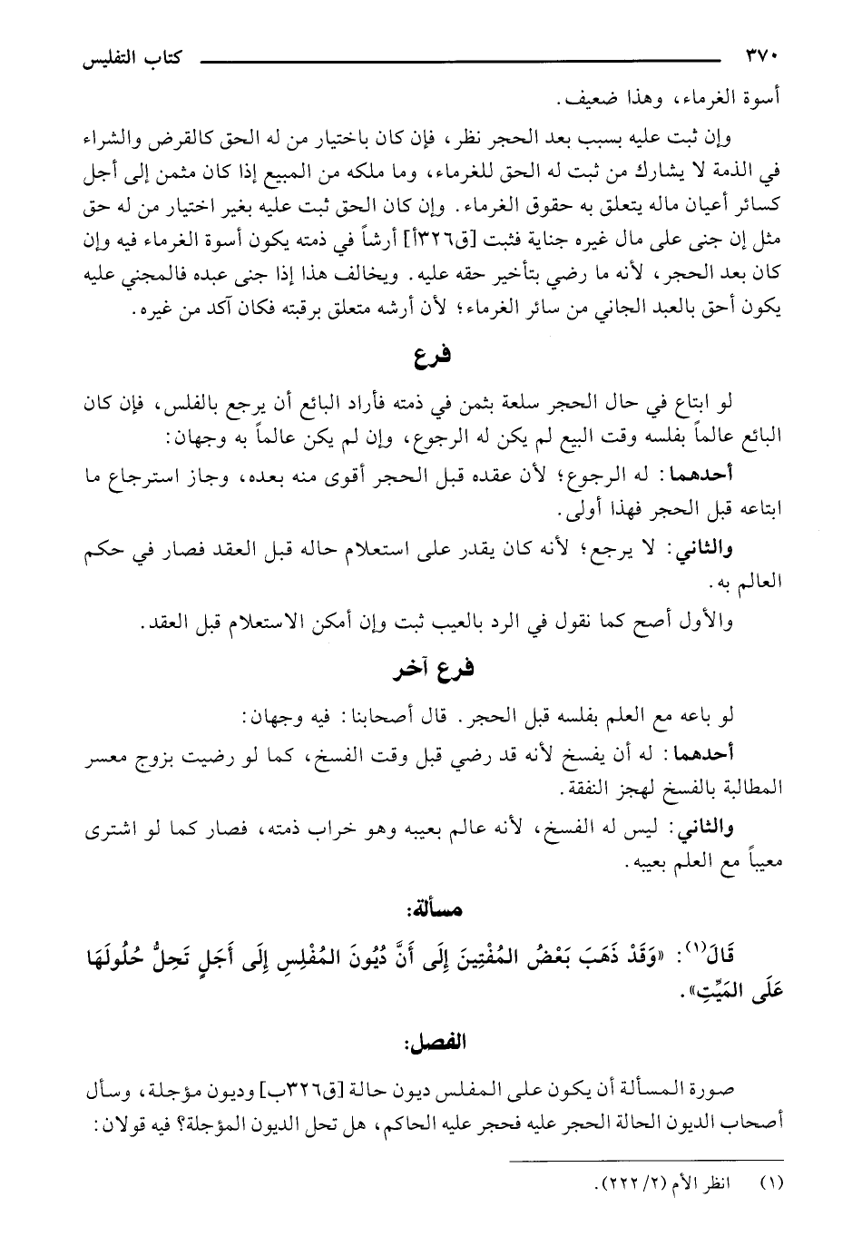 قَالَ: "وَقَدْ ذَهَبَ بَعْضُ المُفْتِينَ إِلَى أَن? دُيُونَ المُفْلِسِ إِلَى أَجَلٍ تَحِل حُلُولَهَا عَلَى المَيًتِ".