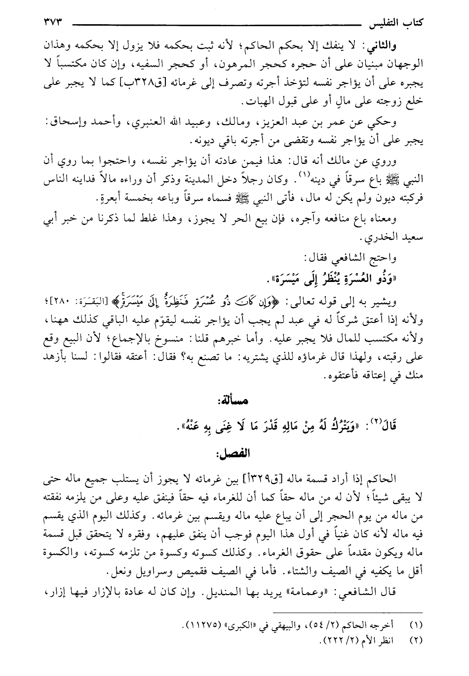 والثاني: لا ينفك إلا بحكم الحاكم؛ لأنه ثبت بحكمه فلا يزول إلا بحكمه وهذان الوجهان مبينان على أن حجره كحجر المرهون, أو كحجر السفيه, وإن كان مكتسبًا لا يجبره على أو يؤاجر نفسه لتؤخذ أجرته وتصرف إلى غرمائه [ق 328 ب] كما لا يجبر على خلع زوجته على مال أو على قبول الهبات.