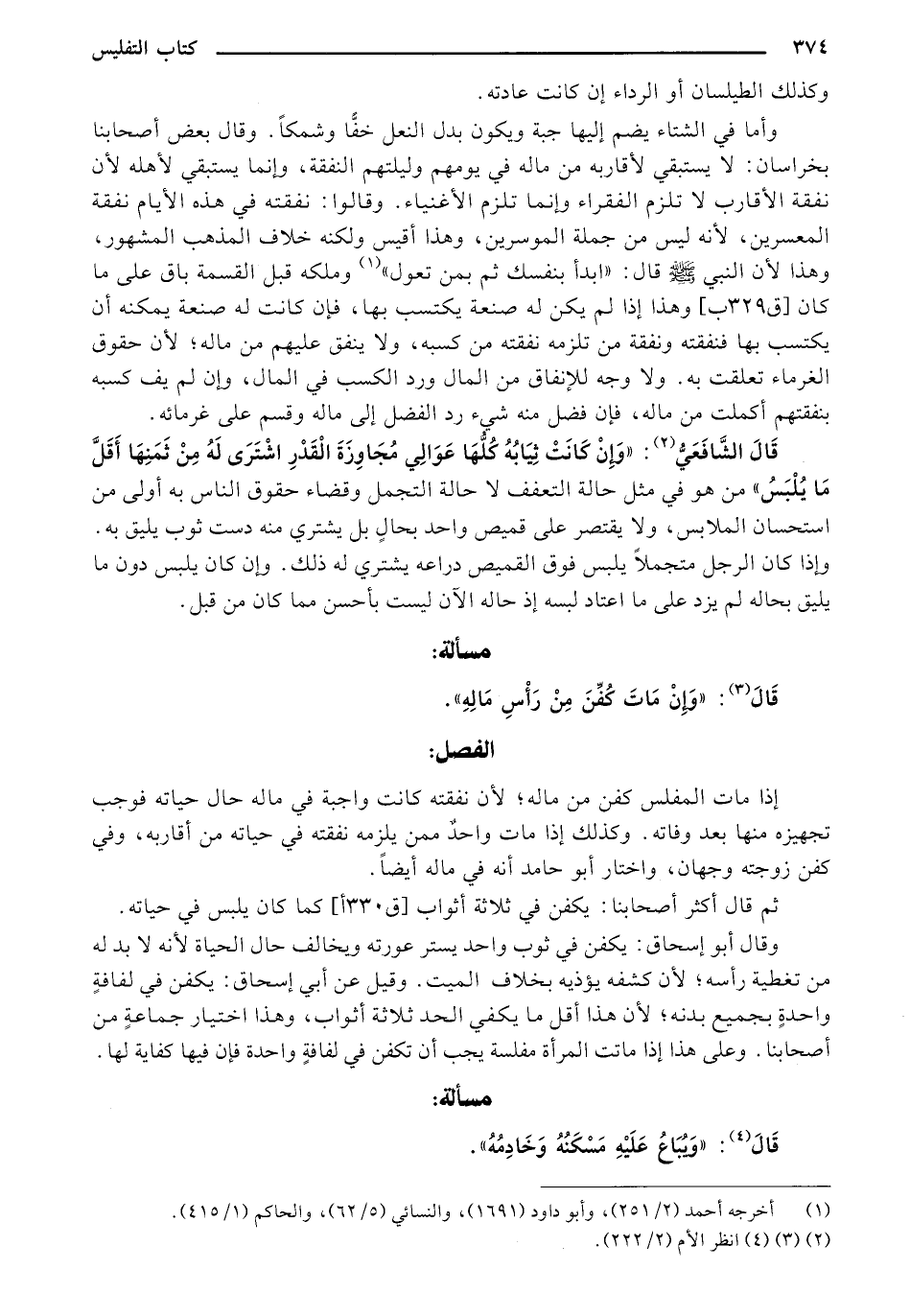 وأما في الشتاء يضم إليها جبة ويكون بدل النعل خفًا وشمكًا, وقال بعض أصحابنا بخراسان: لا يستبقي لأقاربه من ماله في يومهم وليلتهم النفقة, وإنما يستبقي لأهله لأن نفقة الأقارب لا تلزم الفقراء وإنما تلزم الأغنياء, وقالوا: نفقته في هذه الأيام نفقة المعسرين, لأنه ليس من جملة الموسرين, وهذا أقيس ولكنه خلاف المذهب المشهور, وهذا لأن النبي صلى الله عليه وسلم قال: "ابدأ بنفسك ثم بمن تعول" وملكة قبل القسمة باق على ما كان [ق 329 ب] وهذا إذا لم يكن له صنعة يكتسب بها, فإن كانت له صنعة يمكنه أن يكتسب بها فنفقته ونفقة من تلزمه نفقته من كسبه, ولا ينفق عليهم من ماله؛ لأن حقوق الغرماء تعلقت به.