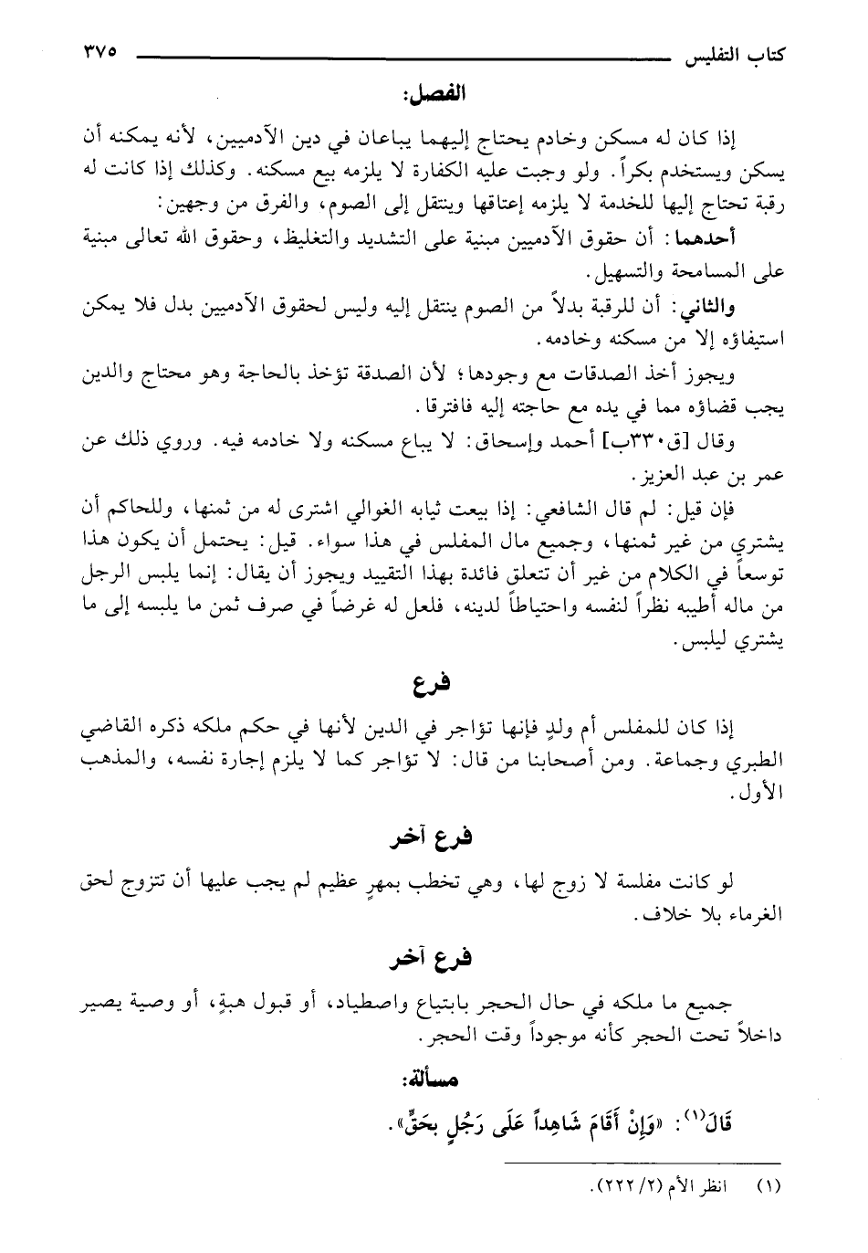 فإن قيل: لم قال الشافعي: إذا بيعت ثيابه الغوالي اشترى له من ثمنها, وللحاكم أن يشتري من غير ثمنها, وجميع مال المفلس في هذا سواء, قيل: يحتمل أن يكون هذا توسعًا في الكلام من غير أن تتعلق فائدة بهذا التقييد ويجوز أن يقال: إنما يلبس الرجل من ماله أطيبه نظرًا لنفسه واحتياطه لدينه, فلعل له غرضًا في صرف ثمن ما يلبسه إلى ما يشتري ليلبس.