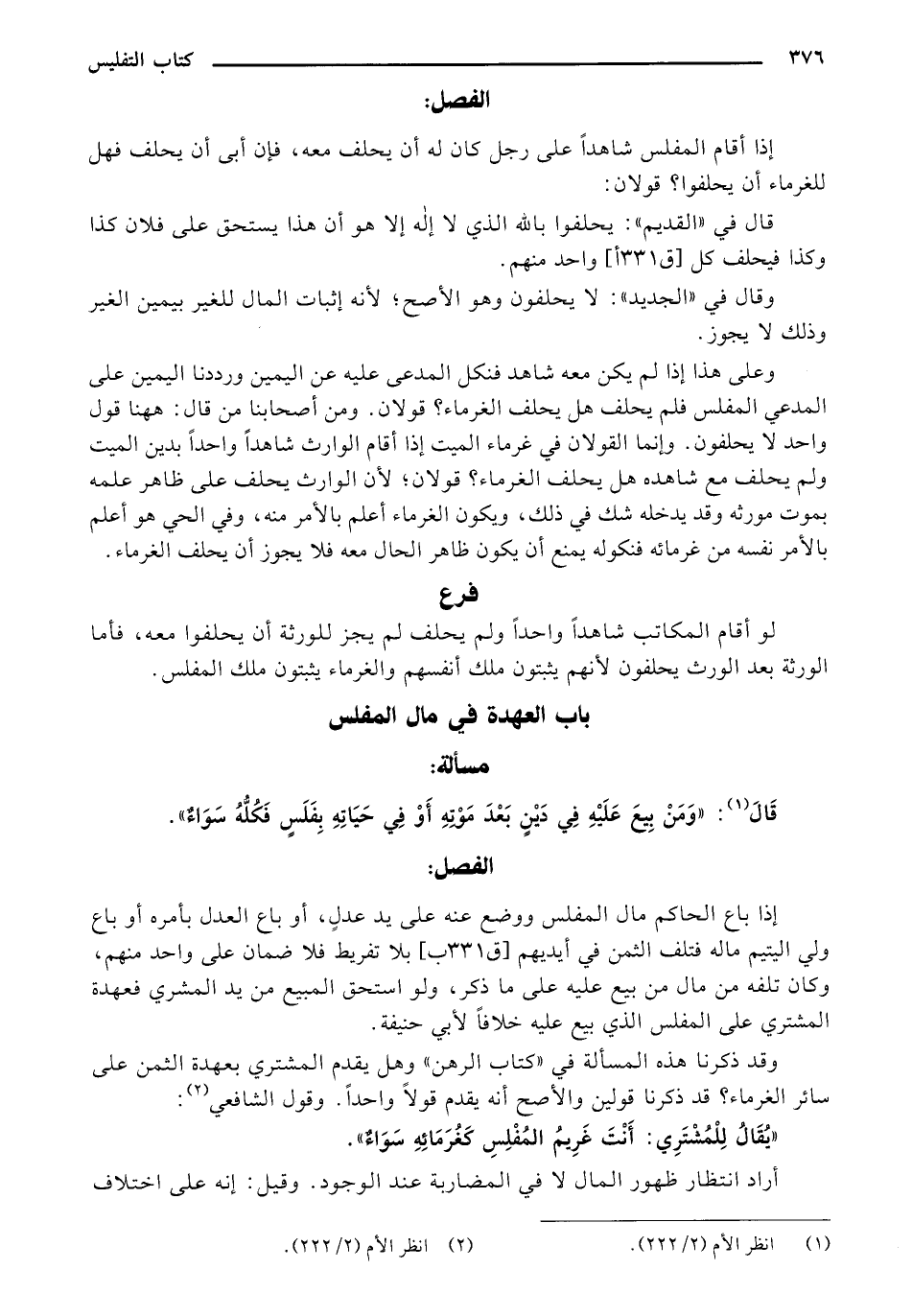 إذا أقام المفلس شاهدًا على رجل كان له أن يحلف معه, فإن أبى أن يحلف فهل للغرماء أن يحلفوا؟ قولان: