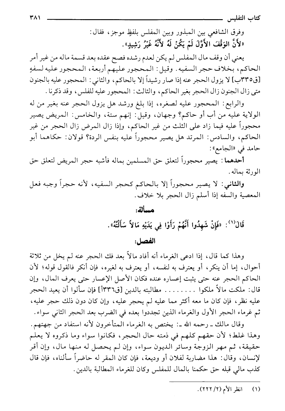 وفرق الشافعي بين المبذور وبين المفلس بلفظ موجز, فقال: