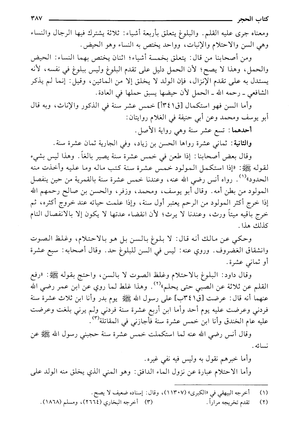 وأما السن فهو استكمال [ق 341 أ] خمس عشر سنة في الذكور والإناث, وبه قال أبو يوسف ومحمد وعن أبي حنيفة في الغلام روايتان: