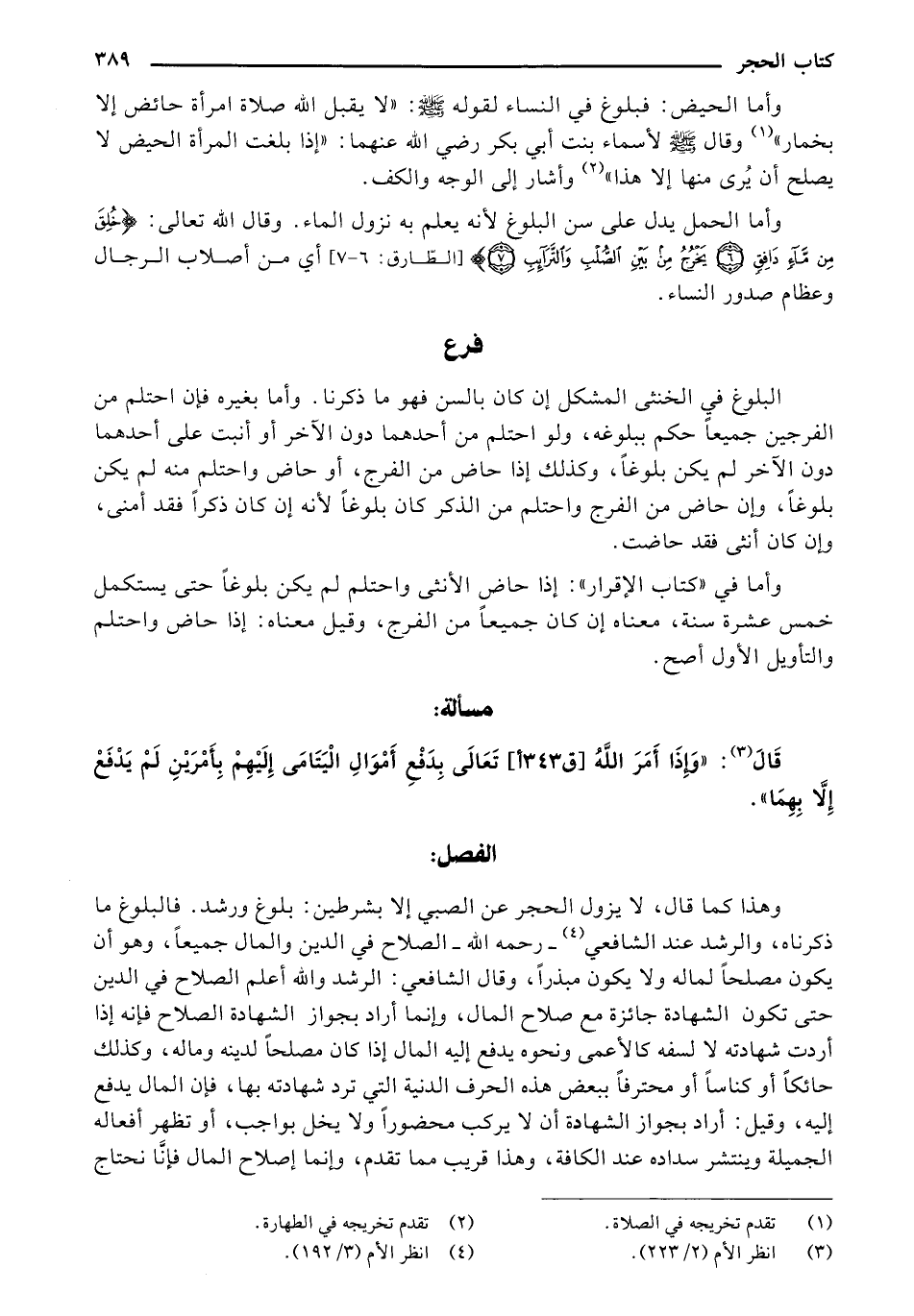 أما الحيض: فبلوغ في النساء لقوله صلى الله عليه وسلم: "لا يقبل الله صلاة امرأة حائض إلا بخمار" وقال صلى الله عليه وسلم لأسماء بنت أبي بكر رضي الله عنهما: "إذا بلغت المرأة الحيض لا يصلح أن يرى منها إلا هذا" وأشار إلى الوجه والكف.