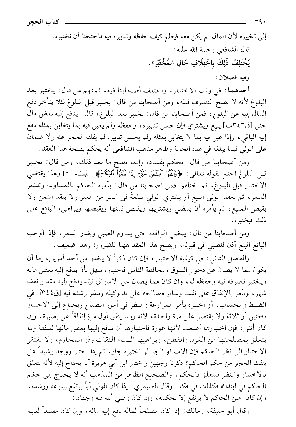 أحدهما: في وقت الاختبار, واختلف أصحابنا فيه, فمنهم من قال: يختبر بعد البلوغ لأنه لا يصح التصرف قبله, ومن أصحابنا من قال: يختبر قبل البلوغ لئلا يتأخر دفع المال إليه عن البلوغ, فمن أصحابنا من قال: يختبر بعد البلوغ, قال: يدفع إليه بعد مال حتى [ق 343 ب] يبيع ويشتري فإن حسن تدبيره, وحفظه ولم يعين فيه بما يتغابن بمثله دفع إليه الباقي, وإذا غبن فيه بما لا يتغابن بمثله ولم يحسن تدبيره لم يفك الحجر عنه ولا ضمان على الولي فيما يبلغه في هذه الحالة وظاهر مذهب الشافعي أنه يحكم بصحة هذا العقد.