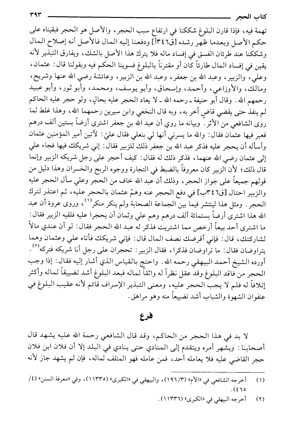 تهمة فيه, فإذا قارن البلوغ شككنا في ارتفاع سبب الحجر, والأصل هو الحجر فبقيناه على حكم الأصل وبعدما ظهر رشده [ق 346 أ] ودفعنا إليه المال فالأصل أنه إصلاح المال وشككنا عند طرئان الفسق في إفساد ماله فلا يترك هذا الأصل بالشك, ويفارق التبذير لأنه يقين في إفساد المال طارئًا كان أو مقترنًا بالبلوغ فسوينا الحكم فيه وبقولنا قال: عثمان, وعلي, والزبير, وعبد الله بن جعفر, وعبد الله بن الزبير, وعائشة رضي الله عنها وشريح, ومالك, والأوزاعي, وأحمد, وإسحاق, وأبو يوسف, ومحمد, وأبو ثور, وأبو عبيد رحمهم الله, وقال أبو حنيفة -رحمه الله- لا يعاد الحجر عليه بحال, ولو حجر عليه الحاكم لم ينفذ حتى يقضي قاض آخر به, وبه قال النخعي وابن سيرين رحمهما الله, وهذا غلط لما روى الشافعي من الأثر, وبيانه ما روي أن عبد الله بن جعفر اشترى أرضًا بستين ألف درهم فعبر فيها عثمان فقال: والله ما يسرني أنها لي بنعلي فقال علي: لآتين أمير المؤمنين عثمان وأسأله أن يحجر عليه فذكر عبد الله بن جعفر ذلك للزبير فقال: إني شريكك فيها فجاء علي إلى عثمان رضي الله عنهما, فذكر ذلك له فقال: كيف أحجر على رجل شريكه الزبير وإنما قال ذلك, لأن الزبير كان معروفًا بالضبط في التجارة ووجوه الربح والخسران وهذا دليل من قولهم جميعًا على جواز الحجر وعلى سأل الحجر عليه والزبير احتال [ق 346 ب] في دفع الحجر عنه وهم عثمان بالحجر عليه, ثم اعتذر لترك الحجر, ومثل هذا لينتشر فيما بين الجماعة الصحابة ولم ينكر منكر, وروى عروة أن عبد الله هذا اشترى أرضًا بستمائة ألف درهم وهم على وثمان أن يحجرا عليه فلقيه الزبير فقال: ما اشترى أحد بيعًا أرخص مما اشتريت فذكر له عبد الله الحجر فقال: لو أن عندي مالًا لشاركتك, قال: فإني أقرضك نصف المال قال: فإني شريكك فأتاه علي وعثمان وهما يتراوضان فقال: ما تراوضان فذكرا, فقال الزبير: تحجران على رجل أنا شريكه فتركه.