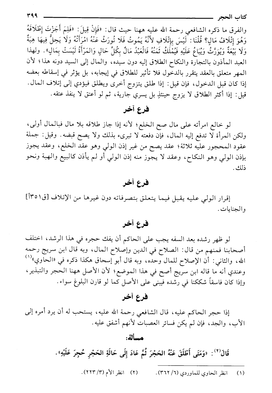 والفرق ما ذكره الشافعي رحمة الله عليه ههنا حيث قال: " فإن قيل: "فلم أجزت إطلاقه وهو إتلاف مال؟ قلنا: ليس بإتلاف لأنه يموت فلا تورث عنه امرأته ولا يحل فيها هبة ولا بيعه ويورث ويباع عليه فيملك ثمنه فالعبد مال بكل حال والمرأة ليست بمال ", ولهذا العبد المأذون بالتجارة والنكاح الطلاق إليه دون سيده, والمال إلى السيد دونه هذا, لأن المهر متعلق بالعقد يتقرر بالدخول فلا تأثير للطلاق في إيجابه, بل يؤثر في إسقاطه بعضه إذا كان قبل الدخول, فإن قيل: إذا طلق يتزوج أخرى ويطلق فيؤدى إلى إتلاف المال, قيل: إذا أكثر الطلاق لا يزوج حينئذ بل يسري جارية, ثم لو أعتق لا ينفذ عتقه.