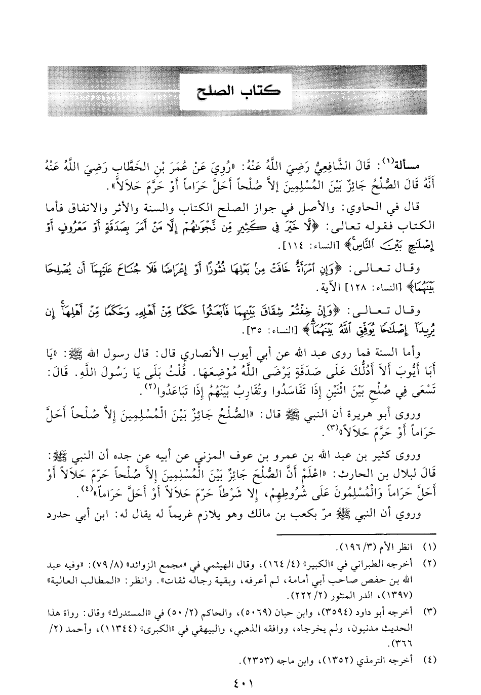 مسألة: قال الشافعي رضي الله عنه: "روي عن عمر بن الخطاب رضي الله عنه أنه قال الصلح جائز بين المسلمين إلا صلحا احل حراماً أو حرم حلالا".