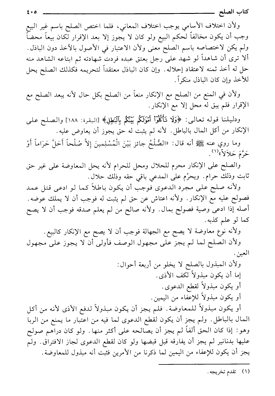 أو يكون مبذولاً للمعاوضة. فلم يجز أن يكون مبذولاً لدفع الأذى لأنه من أكل المال بالباطل. ولم يجز أن يكون لقطع الدعوى لما فيه من اعتبار ما يمنع من الربا وهو: إذا كان الحق ألفاً لم يجز أن يصالحه علي أكثر منها. ولو كان دراهم صولح عليهم بدنانير لم يجز أن يفارقه قبل قبضها ولو كان لقطع الدعوى لجاز الافتراق. ولم يجز أن يكون للإعفاء من اليمين لما ذكرنا من الأمرين فثبت انه مبذول للمعاوضة.