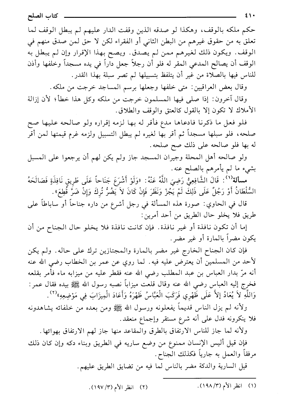 فإن كان الجناح الخارج غير مضر بالمارة والمجتازين ترك علي حالة. ولم يكن لأحد من المسلمين ان يعترض عليه فيه. لما روي عن عمر بن الخطاب رضي الله عنه انه مر بدار العباس بن عبد المطلب رضي الله عنه فقطر عليه من ميزابه ماء فأمر بقلعه فخرج إليه العباس رضي الله عنه وقالت ميزاباً نصبه رسول الله صلي الله عليه وسلم بيده فقال عمر: والله لا يعاد إلا علي ظهري فركب العباس ظهره وأعاد الميزاب في موضعه".