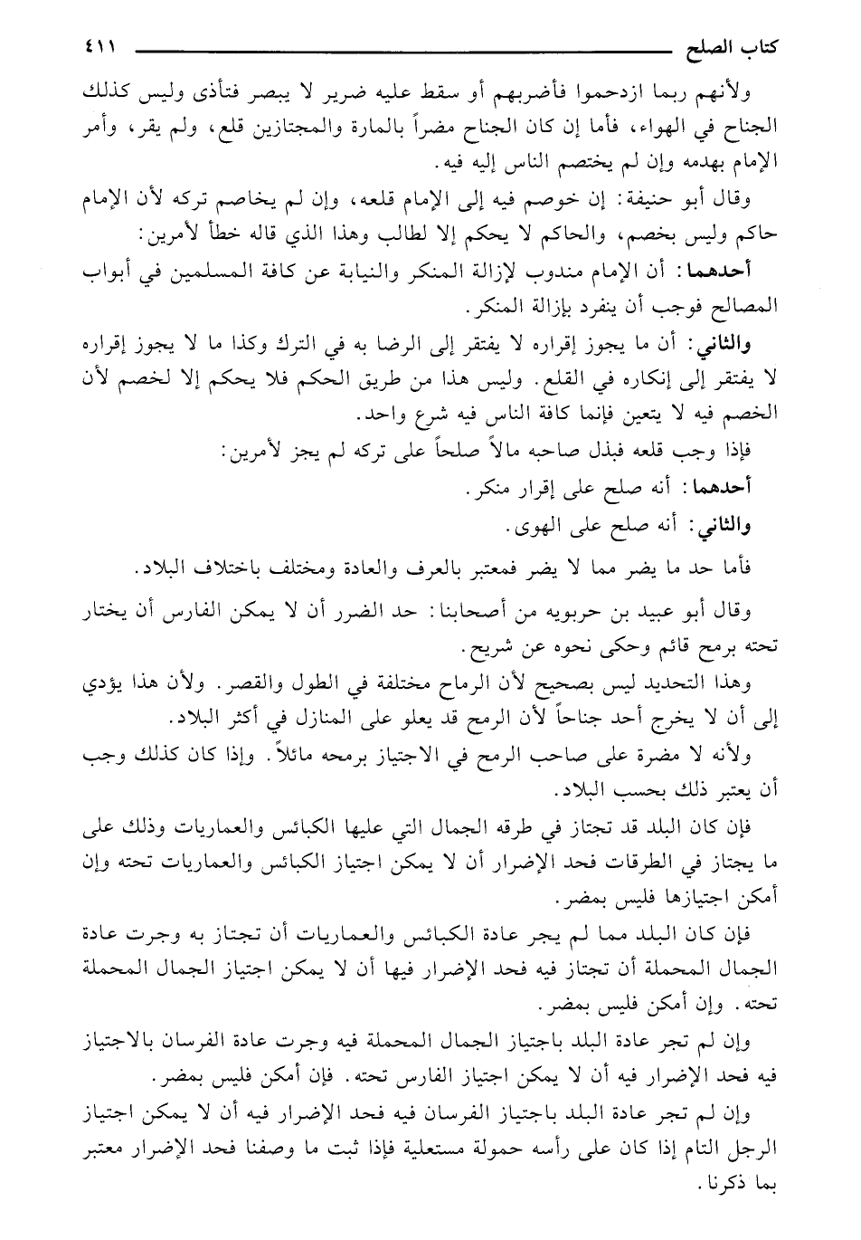 فإن كان البلد قد تجتاز في طرقه الجمال التي عليها الكبائس والعماريات وذلك علي ما يجتاز في الطرقات فحد الإضرار أن لايمكن اجتياز الكبائس والعماريات تحته وإن أمكن اجتيازها بمضر.