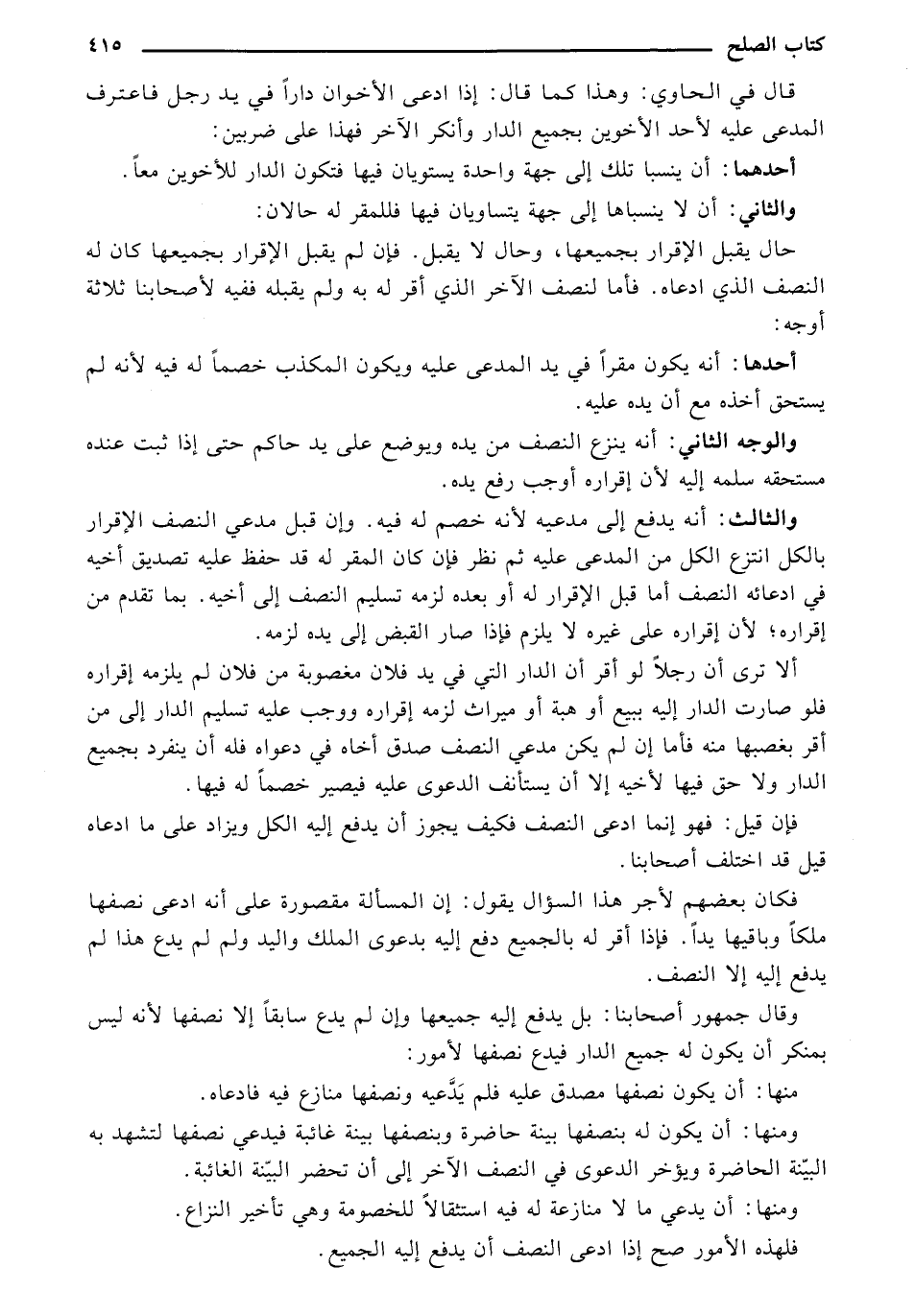 ألا تري أن رجلاً لو أقر أن الدار التي في يد فلان مغصوبة من فلان لم يلزمه إقراراه فلو صارت الدار إليه ببيع أو هبة أو ميراث لزمه إقراراه ووجب عليه تسليم الدار إلي من اقر بغصبها منه فأما إن لم يكن مدعي النصف صدق أخاه في دعواه فله أن ينفرد بجميع الدار ولا حق فيها لأخيه إلا أن يستأنف الدعوي عليه فيصير خصماً له فيها.