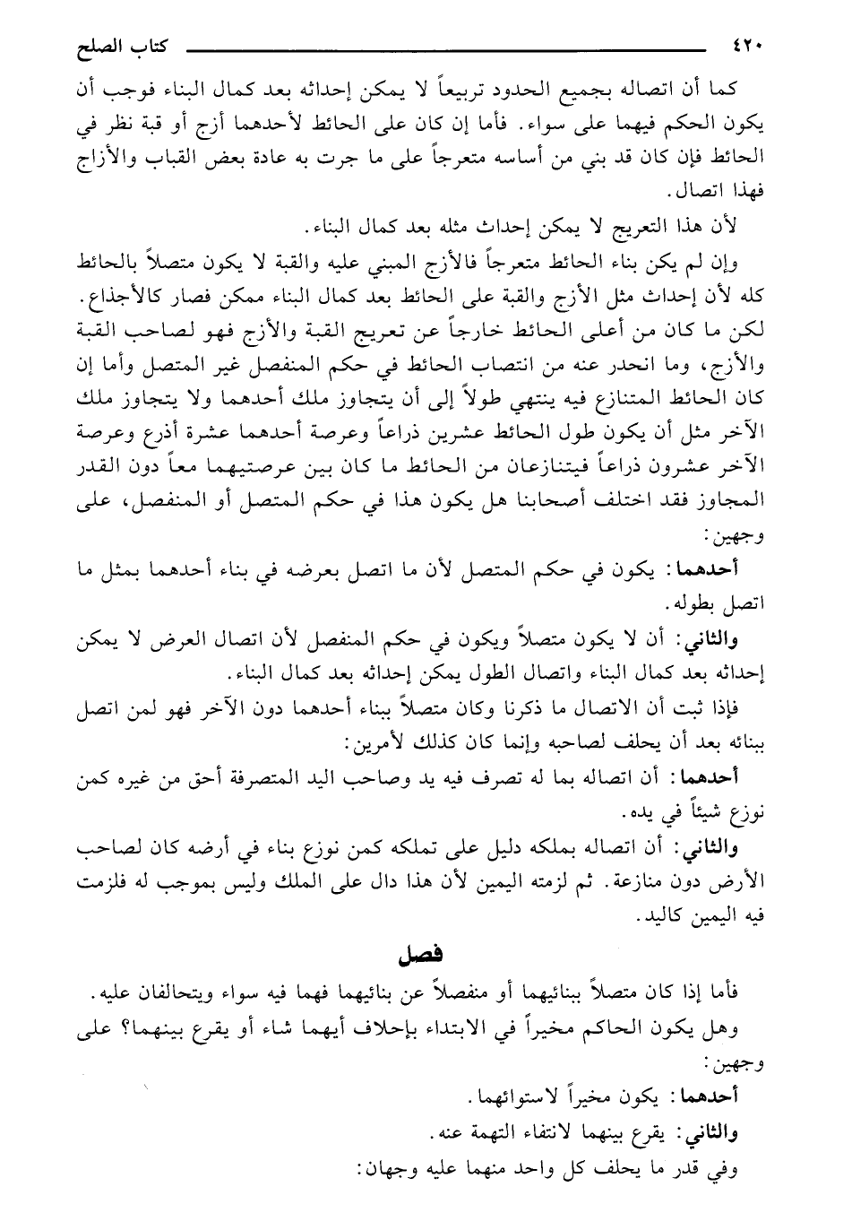 كما أن اتصاله بجميع الحدود تربيعاً لا يمكن إحداثه بعد كمال البناء فوجب أن يكون الحكم فيهما علي سواء. فأما أن كان علي الحائط لأحدهما أزج أو قبة نظر في الحائط فإن كان قد بني من أساسه متعرجاً علي ما جرت به عادة بعض القباب والازاج فهذا اتصال.
