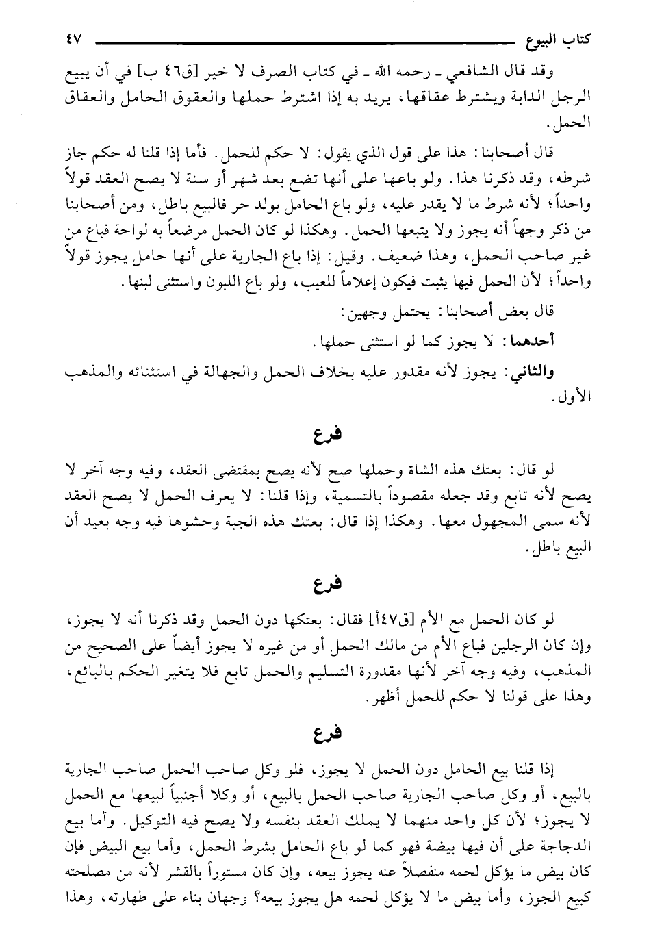 وقد قال الشافعي -رحمه الله -في كتاب الصرف لا خير [ق 46 ب] في أن يبيع الرجل الدابة ويشترط عقاقها، يريد به إذا اشترط حملها والعقوق الحامل والعقاق الحمل.