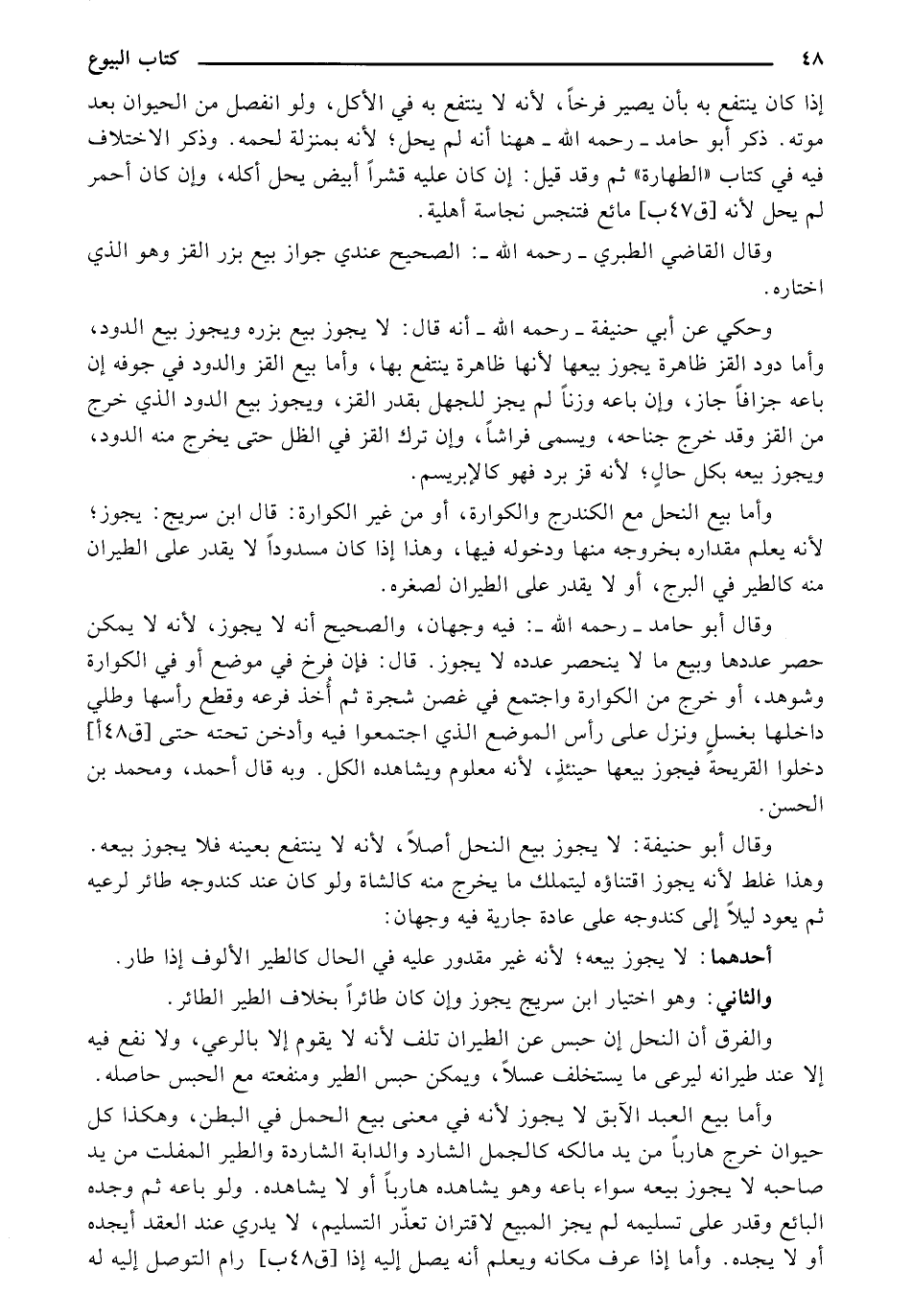 وحكي عن أبي حنيفة -رحمه الله -أنه قال: لا يجوز بيع بزره ويجوز بيع الدود، وأما دود القز ظاهرة يجوز بيعها لأنها ظاهرة ينتفع بها، وأما بيع القز والدود في جوفه إن باعه جزافًا جاز، وإن باعه وزنًا لم يجز للجهل بقدر القز، ويجوز بيع الدود الذي خرج من القز وقد خرج جناحه، ويسمى فراشًا، وإن ترك القز في الظل حتى يخرج منه الدود، ويجوز بيعه بكل حالٍ؛ لأنه قز برد فهو كالإبريسم.