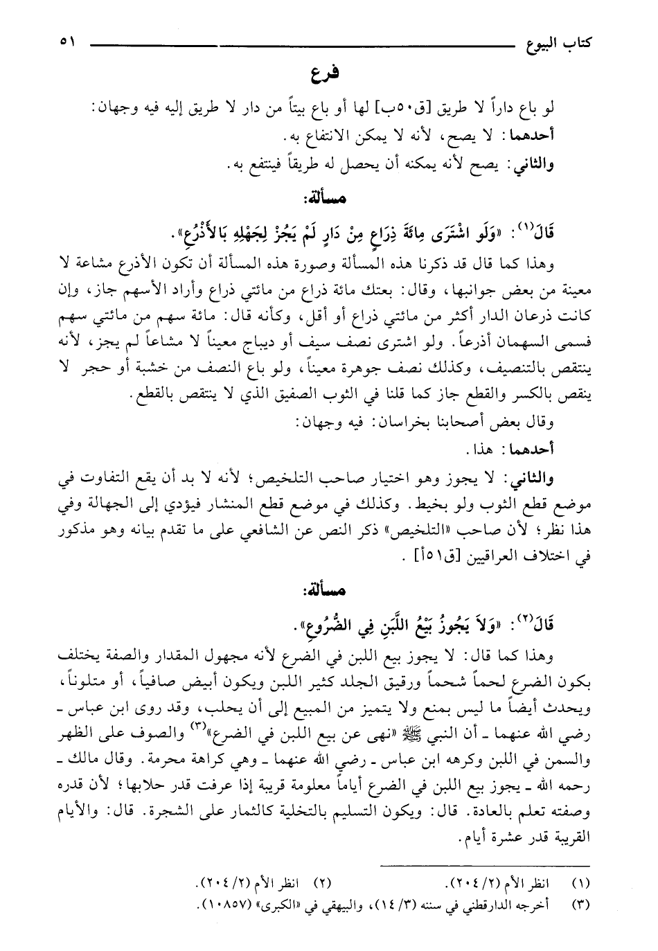 وهذا كما قال قد ذكرنا هذه المسألة وصورة هذه المسألة أن تكون الأذرع مشاعة لا معينة من بعض جوانبها، وقال: بعتك مائة ذراع من مائتي ذراع وأراد الأسهم جاز، وإن كانت ذرعان الدار أكثر من مائتي ذراع أو أقل، وكأنه قال: مائة سهم من مائتي سهم فسمى السهمان اذرعًا. ولو اشترى نصف سيف أو ديباج معينًا لا مشاعًا لم يجز، لأنه ينتقص بالتنصيف، وكذلك نصف جوهرة معينًا، ولو باع النصف من خشبة أو حجر لا ينقص بالكسر والقطع جاز كما قلنا في الثوب الصفيق الذي لا ينتقص بالقطع.