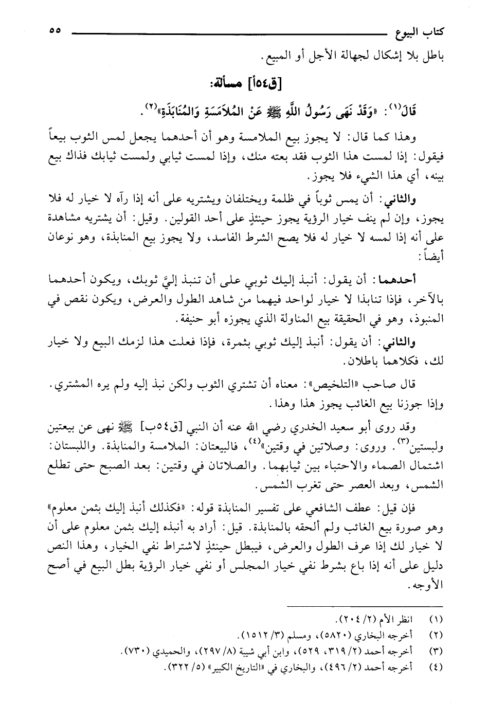 وقد روى أبو سعيد الخدري رضي الله عنه أن النبي [ق 54 ب] صلى الله عليه وسلم نهى هن بيعتين ولبستين. وروى: وصلاتين في وقتين"، فالبيعتان: الملامسة والمنابذة. واللبستان: اشتمال الصماء والاحتباء بين ثيابهما. والصلاتان في وقتين: بعد الصبح حتى تطلع الشمس، وبعد العصر حتى تغرب الشمس.