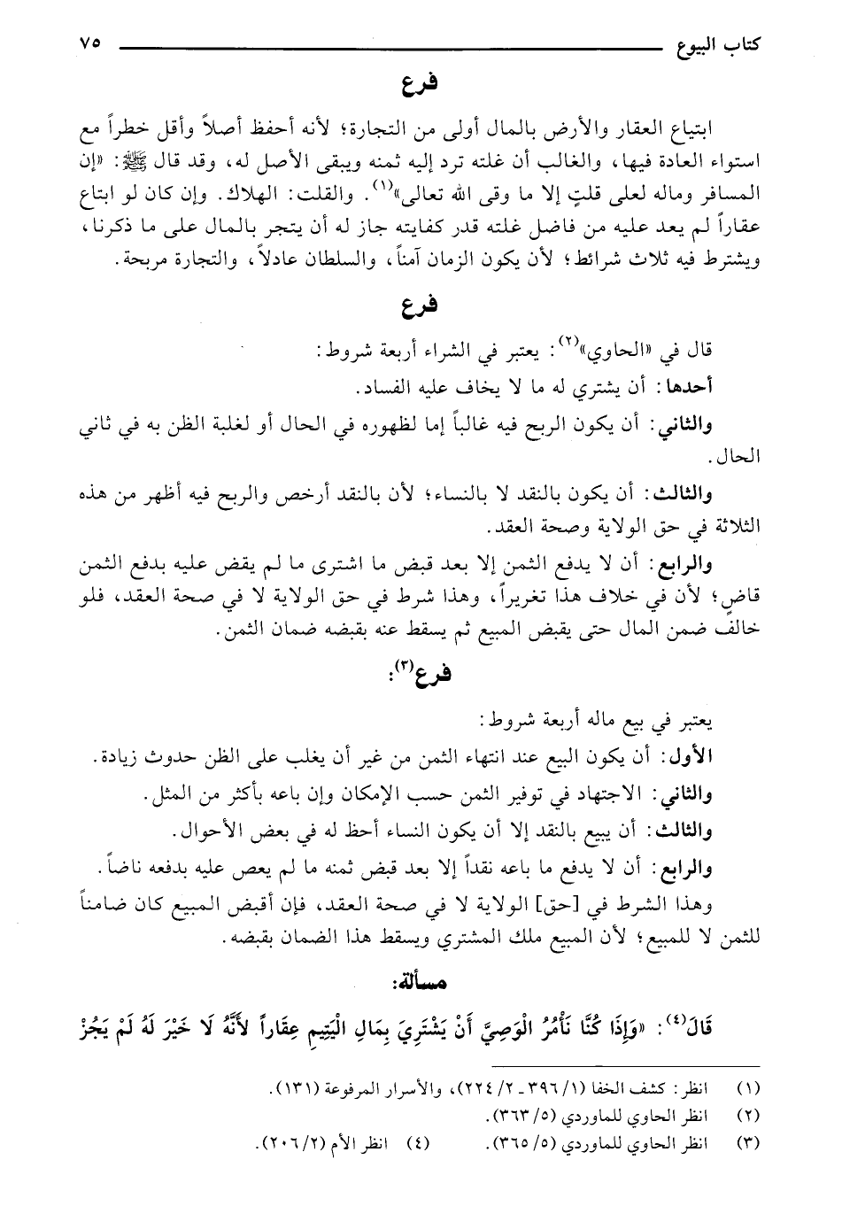ابتياع العقار والأرض بالمال أولى من التجارة؛ لأنه أحفظ أصلًا وأقل خطرًا مع استواء العادة فيها، والغالب أن غلته ترد إليه ثمنه ويبقى الأصل له، وقد قال صلى الله عليه وسلم: "إن المسافر وماله لعلى قلتٍ إلا ما وقى الله تعالى". والقلت: الهلاك. وإن كان لو ابتاع عقارًا لم يعد عليه من فاضل غلته قدر كفايته جاز له أن يتجر بالمال على ما ذكرنا، ويشترط فيه ثلاث شرائط؛ لأن يكون الزمان آمنًا، والسلطان عادلًا، والتجارة مربحة.
