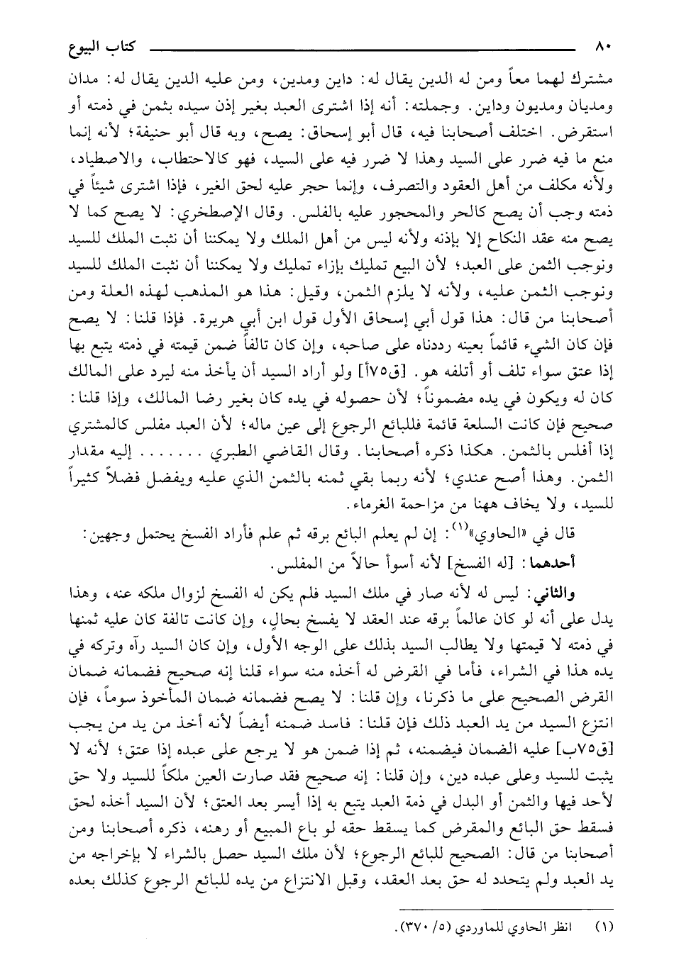 مشترك لهما معًا ومن له الدين يقال له: داين ومدين، ومن عليه الدين يقال له: مدان ومديان ومديون وداين. وجملته: أنه إذا اشترى العبد بغير إذن سيده بثمن في ذمته أو استقرض. اختلف أصحابنا فيه، قال أبو إسحاق: يصح، وبه قال أبو حنيفة؛ لأنه إنما منع فيه ضرر على السيد وهذا لا ضرر فيه على السيد، فهو كالاحتطاب، والاصطياد، ولأنه مكلف من أهل العقود والتصرف، وإنما حجر عليه لحق الغير، فإذا اشترى شيئًا في ذمته وجب أن يصح كالحر والمحجور عليه بالفلس. وقال الإصطخري: لا يصح كما لا يصح منه عقد النكاح إلا بإذنه ولأنه ليس من أهل الملك ولا يمكننا أن نثبت الملك للسيد ونوجب الثمن على العبد؛ لأن البيع تمليك بإزاء تمليك ولا يمكننا أن نثبت الملك للسيد ونوجب الثمن عليه، ولأنه لا يلزم الثمن، وقيل: هذا هو المذهب لهذه العلة ومن أصحابنا من قال: هذا قول أبي إسحاق الأول قول ابن أبي هريرة. فإذا قلنا: لا يصح فإن كان الشيء قائمًا بعينه رددناه على صاحبه، وإن كان تالفًا ضمن قيمته في ذمته يتبع بها إذا عتق سواء تلف أو أتلفه هو. [ق 75 أ] ولو أراد السيد أن يأخذ منه ليرد على المالك كان له ويكون في يده مضمونًا؛ لأن حصوله في يده كان بغير رضا المالك، وإذا قلنا: صحيح فإن كانت السلعة قائمة فللبائع الرجوع إلى عين ماله؛ لأن العبد مفلس كالمشتري إذا أفلس بالثمن. هكذا ذكره أصحابنا. وقال القاضي الطبري ..... إليه مقدار الثمن. وهذا أصح عندي؛ لأنه ربما بقي ثمنه بالثمن الذي عليه ويفضل فضلًا كثيرًا للسيد، ولا يخاف ههنا من مزاحمة الغرماء.
