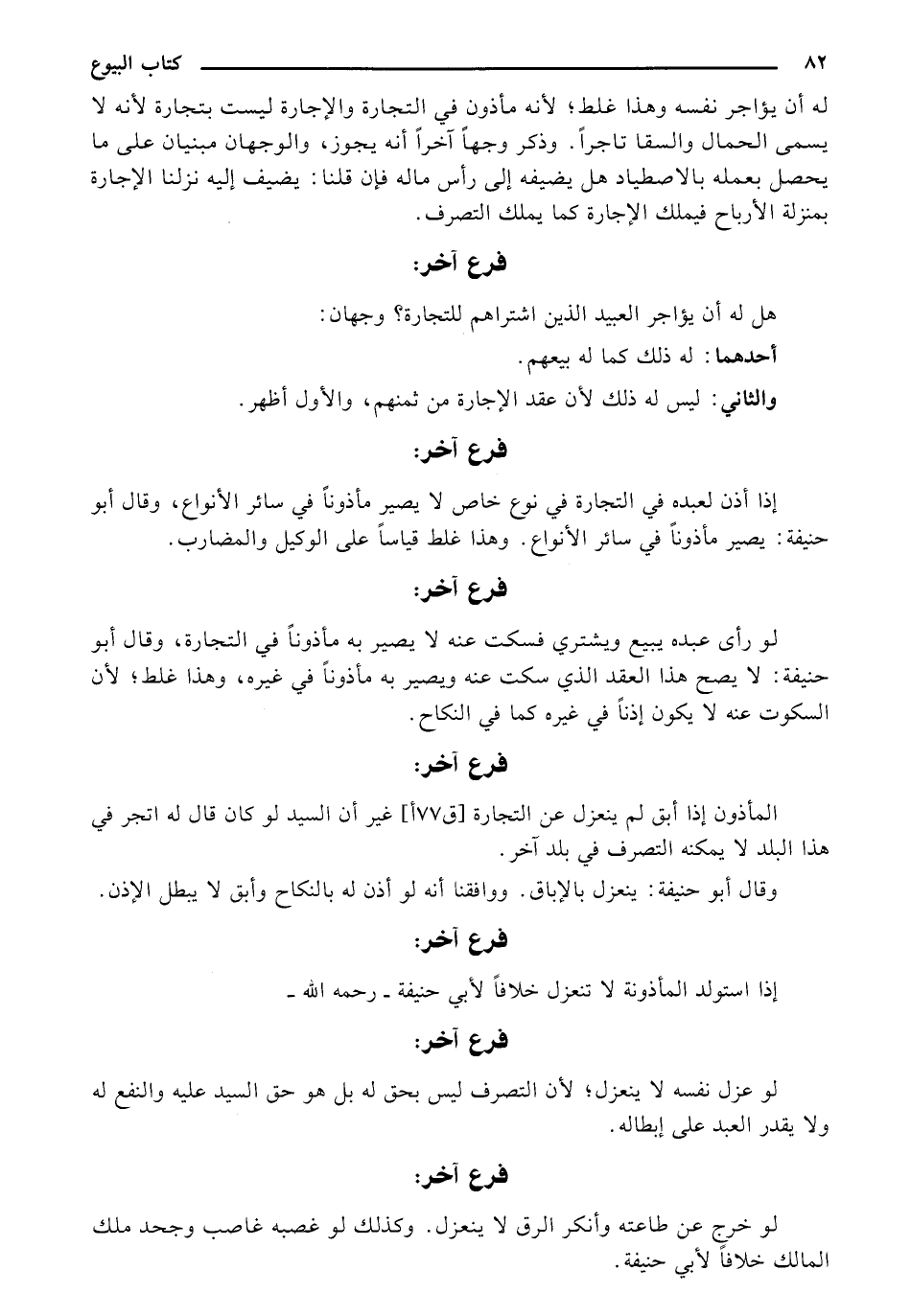 المأذون إذا أبق لم ينعزل عن التجارة [ق 77 أ] غير أن السيد لو كان قال له اتجر في هذا البلد لا يمكنه التصرف في بلد آخر.