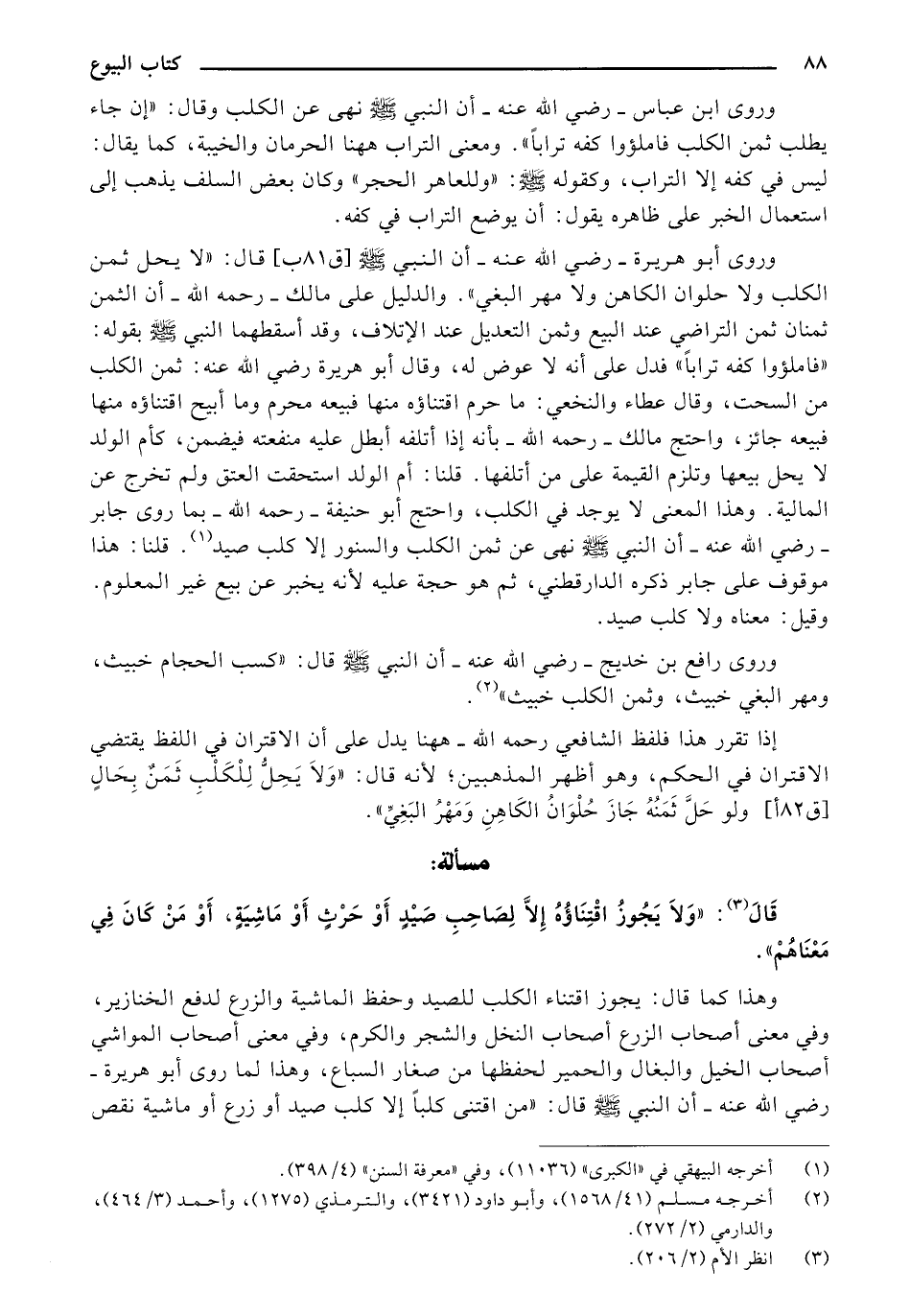 وهذا كما قال: يجوز اقتناء الكلب للصيد وحفظ الماشية والزرع لدفع الخنازير, وفي معنى أصحاب الزرع أصحاب النخل والشجر والكرم, وفي معنى أصحاب المواشي أصحاب الخبل والبغال والحمير لحفظها من صغار السباع, وهذا لما روي أبو هريرة- رضي الله عنه- أن النبي صلى الله عليه وسلم قال: "من اقتنى كلبَا إلا كلب صيد أو زرع أو ماشية نقص.