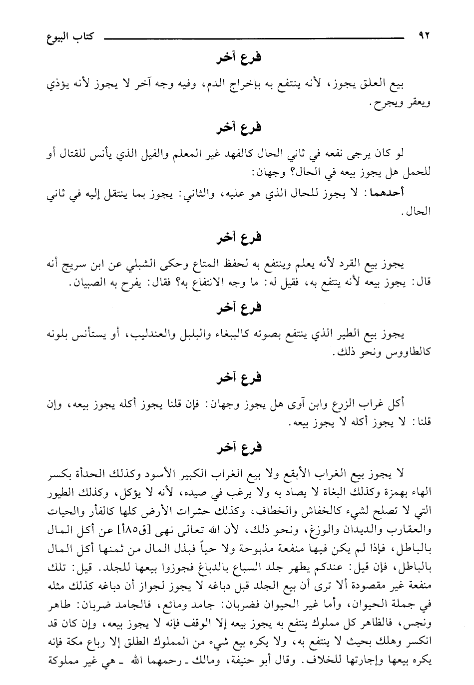 لا يجوز بيع الغراب الأبقع ولا الغراب الكبير الأسود وكذلك الحدأة بكسر الهاء بهمزة وكذلك البغاة لا يصاد به ولا يرغب في صيده, لأنه يؤكل, كذلك الطيور التي لا تصلح لشيء كالخفاش والخطاف, وكذلك حشرات الأرض كلها كالفأر والحيات والعقارب والديدان والوزغ, ونحو ذلك لأن الله تعالي نهى [ق 85 أ] عن أكل المال بالباطل, فإذا لم يكن فيها منفعة مذبوحة ولا حيا فبذل المال من ثمنها أكل المال بالباطل, فإن قيل: عندكم يطهر جلده السباع بالدباغ فجوزوا بيعها للجلد. قيل: تلك منفعة غير مقصودة ألا ترى أن بيع الجلد قبل دباغه لا يجوز لجواز أن دباغه كذلك مثله في جملة الحيوان, وأما غير الحيوان فضربان: جامد ومانع, فالجامد ضربان: طاهر ونجس, فالظاهر كل مملوك ينتفع به يجوز بيعه إلا الوقف فإنه لا يجوز بيعه, وإن كان قد انكسر وهلك بحيث لا ينتفع به, ولا يكره بيع شيء من المملوك الطلق إلا رباع مكة فإنه يكره بيعها وإجارتها للخلاف. وقال أبو حنيفة, ومالك- رحمهما الله- هي غير مملوكة