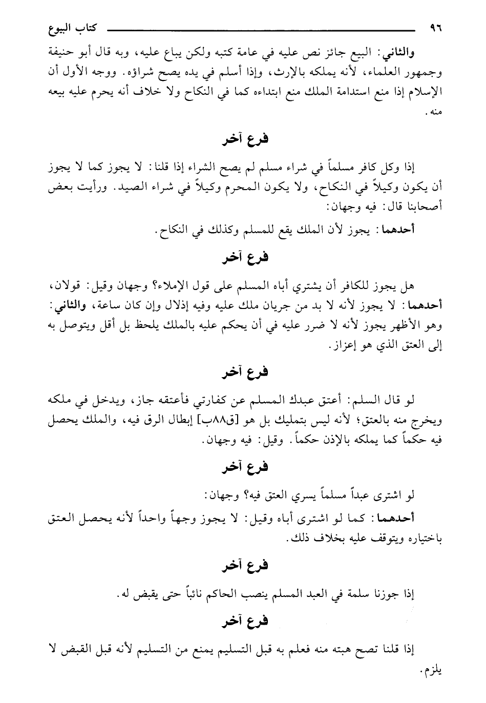 والثاني: البيع جائز نص عليه في عامة كتبه ولكن يباع عليه, وبه قال أبو حنيفة وجمهور العلماء, لأنه يملكه بالإرث, وإذا أسلم في يده يصح شراؤه. ووجه الأول أن الإسلام إذا منع استدامة الملك منع ابتداءه كما في النكاح ولا خلاف أنه يحرم عليه بيعه منه.