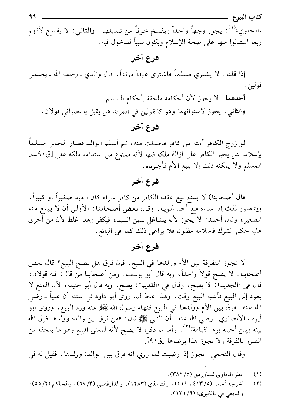 لا تجوز التفرقة بين الأم وولدها في البيع, فإن فرق هل يصح البيع؟ قال بعض أصحابنا: لا يصح قولًا واحدًا, وبه قال أبو يوسف. ومن أصحابنا من قال: فيه قولان, قال في "الجديد": لا يصح, وقال في "القديم": يصح, وبه قال أبو حنيفة؛ لأن المنع لا يعود إلى البيع فأشبه البيع وقت, وهذا غلط لما روي أبو داود في سنته أن عليًا- رضي الله عنه- فرق بين الأم وولدها في البيع فنهاه رسول الله صلى الله عليه وسلم قال: "من فرق بين والدة وولدها فرق الله بينه وبين أحبته يوم القيامة". وأما ما ذكره لا يصح لأنه لمعنى البيع وهو ما يلحقه من الضرر بالفرقة ولا يجوز هذا برضاها [ق 91 أ].