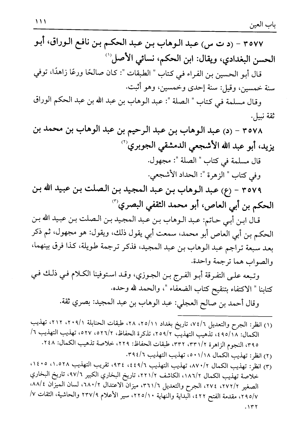 (¬٣) انظر: تهذيب الكمال ٢/ ٨٧٠، تهذيب التهذيب ٦/ ٤٤٩، ٩٣٤، تقريب التهذيب ١٠٥٢٨، ١٤٠٥، خلاصة تهذيب الكمال ٢/ ١٨٦، الكاشف ٢/ ٢٢١، تاريخ البخاري الكبير ٦/ ٩٧، تاريخ البخاري الصغير ٢/ ٢٧٢، ٢٧٤، الجرح والتعديل ٦/ ٣٦١، ميزان الاعتدال ٢/ ٦٨٠، لسان الميزان ٤/ ٨٨، ٧/ ٢٩٥، مقدمة الفتح ٤٢٢، البداية والنهاية ١٠/ ٢٢٥، سير الأعلام ٩/ ٢٣٧ والحاشية، الثقات ٧/ ١٣٢.