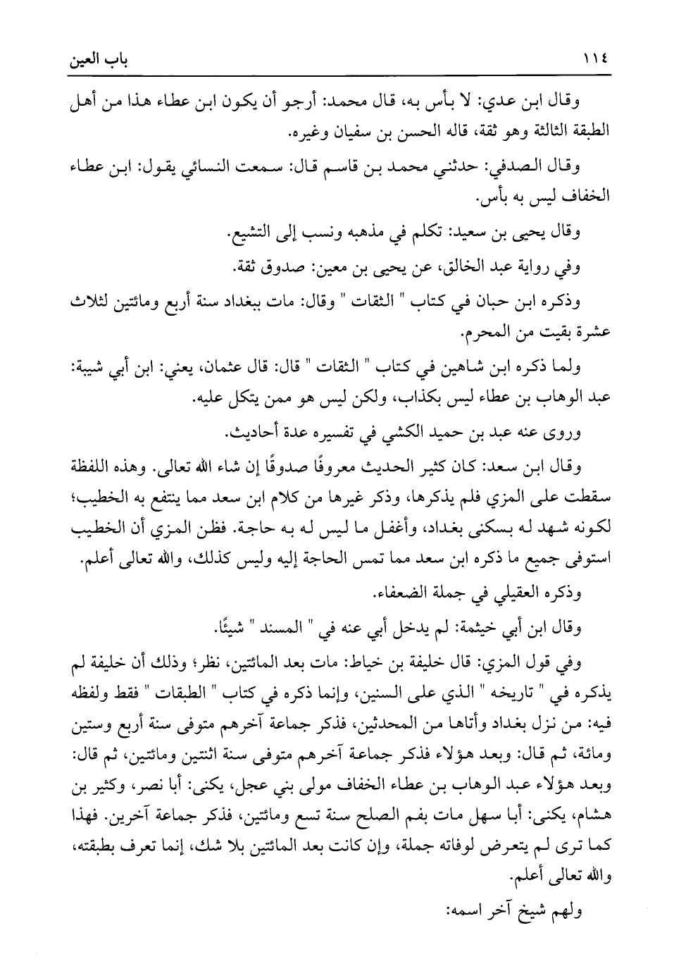 ولما ذكره ابن شاهين في كتاب "الثقات" قال: قال عثمان، يعني: ابن أبي شيبة: عبد الوهاب بن عطاء ليس بكذاب، ولكن ليس هو ممن يتكل عليه.