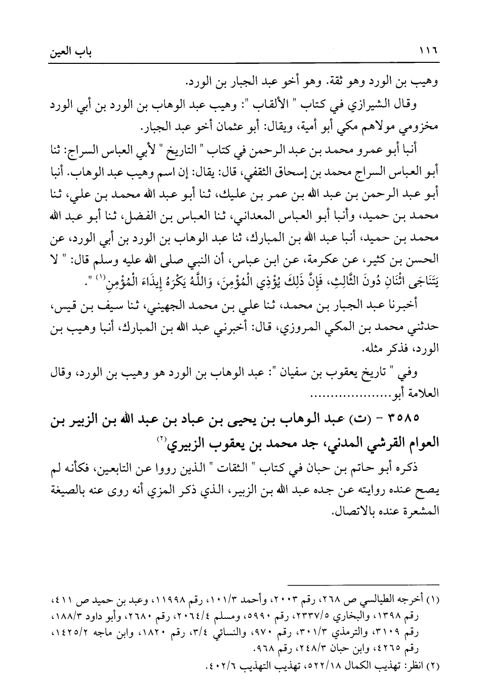 أنبا أبو عمرو محمد بن عبد الرحمن في كتاب "التاريخ" لأبي العباس السراج: ثنا أبو العباس السراج محمد بن إسحاق الثقفي، قال: يقال: إن اسم وهيب عبد الوهاب. أنبا أبو عبد الرحمن بن عبد اللَّه بن عمر بن عليك، ثنا أبو عبد اللَّه محمد بن علي، ثنا محمد بن حميد، وأنبا أبو العباس المعداني، ثنا العباس بن الفضل، ثنا أبو عبد اللَّه محمد بن خميد، أنبا عبد اللَّه بن المبارك، ثنا عبد الوهاب بن الورد بن أبي الورد، عن الحسن بن كثير، عن عكرمة، عن ابن عباس، أن النبي صلى اللَّه عليه وسلم قال: "لا يَتَنَاجَى اثْنَانِ دُونَ الثَّالِثِ، فَإِنَّ ذَلِكَ يُؤْذِي الْمُؤْمِنَ، وَاللَّهُ يَكْرَهُ إِيذَاءَ الْمُؤْمِنِ (¬١) ".