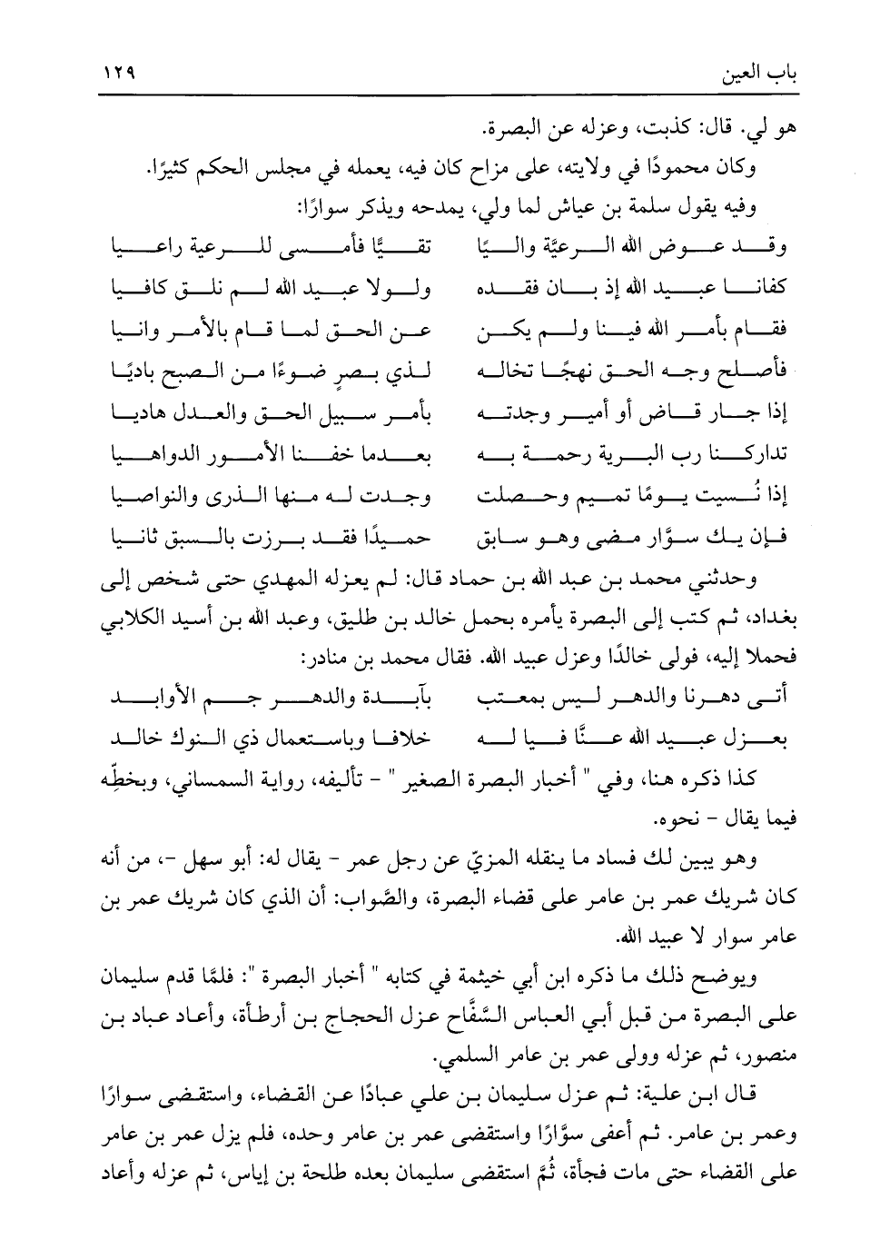 ويوضح ذلك ما ذكره ابن أبي خيثمة في كتابه "أخبار البصرة": فلمَّا قدم سليمان على البصرة من قبل أبي العباس السَّفَّاح عزل الحجاج بن أرطأة، وأعاد عباد بن منصور، ثم عزله وولى عمر بن عامر السلمي.